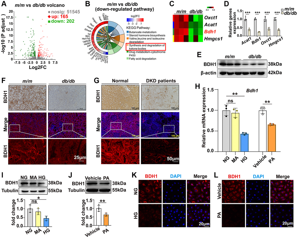 DKD represents a major microvascular complication in patients with diabetes and is the leading cause of chronic kidney disease and end-stage renal disease [2–4]. To gain a comprehensive understanding of potential DKD regulators, we performed RNA-seq analysis by comparing the gene expression in the kidneys of db/db and m/m mice at the age of 20 weeks when db/db mice exhibited an apparent increase in the urinary albumin-to-creatinine ratio (ACR) (Supplementary Figure 1). The volcano plot in Figure 1A shows that 165 upregulated differentially expressed genes (DEGs) and 202 downregulated DEGs were identified in the kidneys of db/db mice (detailed information on DEGs is provided in the Supplementary Table 1). Kyoto Encyclopedia of Genes and Genomes (KEGG) analysis shows that the “synthesis and degradation of ketone bodies” pathway is significantly downregulated (Figure 1B, 1C). Given that KD has been reported as an effective treatment for diabetes [29, 30], we presumed that the downregulation of the synthesis and degradation of ketone body pathways participates in the pathogenesis of DKD. Consistently, qRT-PCR analysis confirmed that the expression of Bdh1, Oxct1, Acat1, and Hmgcs1 was altered (Figure 1D). Among these four pathway members, Bdh1 has been reported to protect the heart from heart failure in a transverse aortic constriction mouse model [27]. Thus, to identify whether Bdh1 is involved in the pathogenesis of DKD, we further identified the protein level of BDH1. As shown in Figure 1E, the protein level of BDH1 in the kidneys of db/db mice is significantly lower than that in the kidneys of m/m mice. Moreover, the decrease in BDH1 expression was confirmed using immunohistochemistry and immunofluorescence (IF) analysis (Figure 1F). Consistent with the DKD mouse model, we observed the downregulation of BDH1 in the renal tissues of diabetic patients with kidney disease using immunohistochemistry and IF staining (Figure 1G). The characteristics of the control subjects and DKD patients are summarized in Supplementary Table 2.