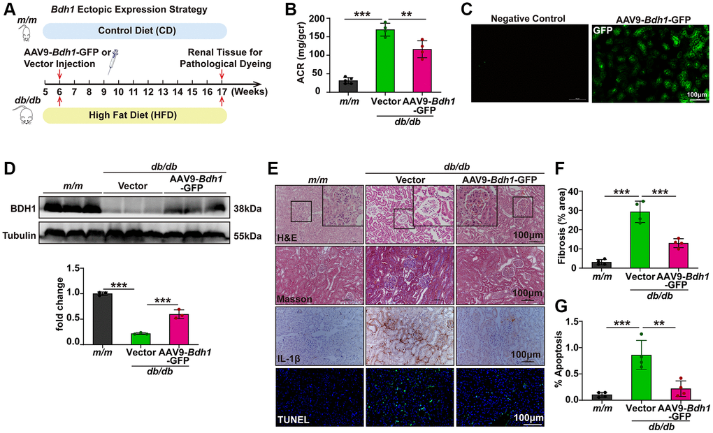 Based on the pronounced ability of BDH1 to inhibit ROS overproduction and inflammation, we explored the therapeutic efficacy of BDH1 in db/db mice. AAV9 is a gene delivery system that is relatively specific for renal expression (Supplementary Figure 3A), therefore, we used AAV9 as a gene delivery tool for renal BDH1 expression. The experimental strategy is illustrated in Figure 2A. Compared with vector-injected db/db mice, AAV9-Bdh1-GFP-injected db/db mice showed increased blood levels of βOHB (Supplementary Figure 3B) and unchanged plasma levels of total cholesterol (Supplementary Figure 3C) and total triglycerides (Supplementary Figure 3D). Eleven weeks after injection of the control or Bdh1-encoding virus, we performed an assay of ACR, which is the most important indicator of kidney function. Although the BDH1 renal expression did not affect the body weight, fasting blood glucose (Supplementary Figure 4A, 4B), and kidney-to-body weight ratio (Supplementary Table 3), we observed a significantly lower ACR in AAV9-Bdh1-GFP-injected mice than that in vector-injected mice (Figure 2B). To confirm whether Bdh1 was effectively expressed in the kidneys of mice based on the AAV9 vector, we measured the fluorescence intensity of GFP, which was co-expressed with Bdh1. AAV9-encoding Bdh1 was successfully delivered to the kidneys 11 weeks after injection (Figure 2C). As expected, we observed increased BDH1 expression in the kidneys of AAV9-Bdh1-GFP-injected mice compared with vector-injected mice (Figure 2D). In further histological analyses, AAV9-Bdh1-GFP-injected db/db mice showed a normal glomerular morphology while vector-injected mice presented glomerular hypertrophy (Figure 2E). In addition, DKD pathology-related fibrosis, inflammation, and apoptosis were substantially reduced by AAV9-Bdh1-GFP injection (Figure 2E–2G). Collectively, these findings strongly support the promising application of BDH1 as a therapeutic target for DKD.