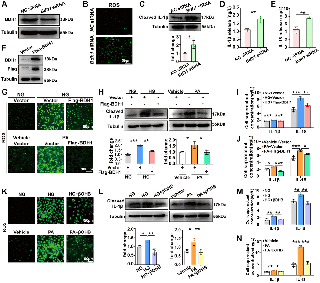 To examine whether BDH1 downregulation contributes to HG- or PA-induced cell injury, we knocked down BDH1 in HK-2 cells (Figure 3A). Given that increased ROS plays a central role in the pathogenesis of diabetic microvascular complications including DKD [33], and that ROS overproduction is related to inflammation [34], we next identified the ROS levels and observed a significant increase in ROS in HK-2 cells transfected with Bdh1 siRNA (Figure 3B). In addition, BDH1 knockdown elevated the protein level of the activated pro-inflammatory factor cleaved IL-1β (Figure 3C) and secretory IL-1β and IL-18 (Figure 3D, 3E). Collectively, these results suggest that BDH1 deficiency mediates HG- or PA-induced cell injury through the loss of anti-ROS function.