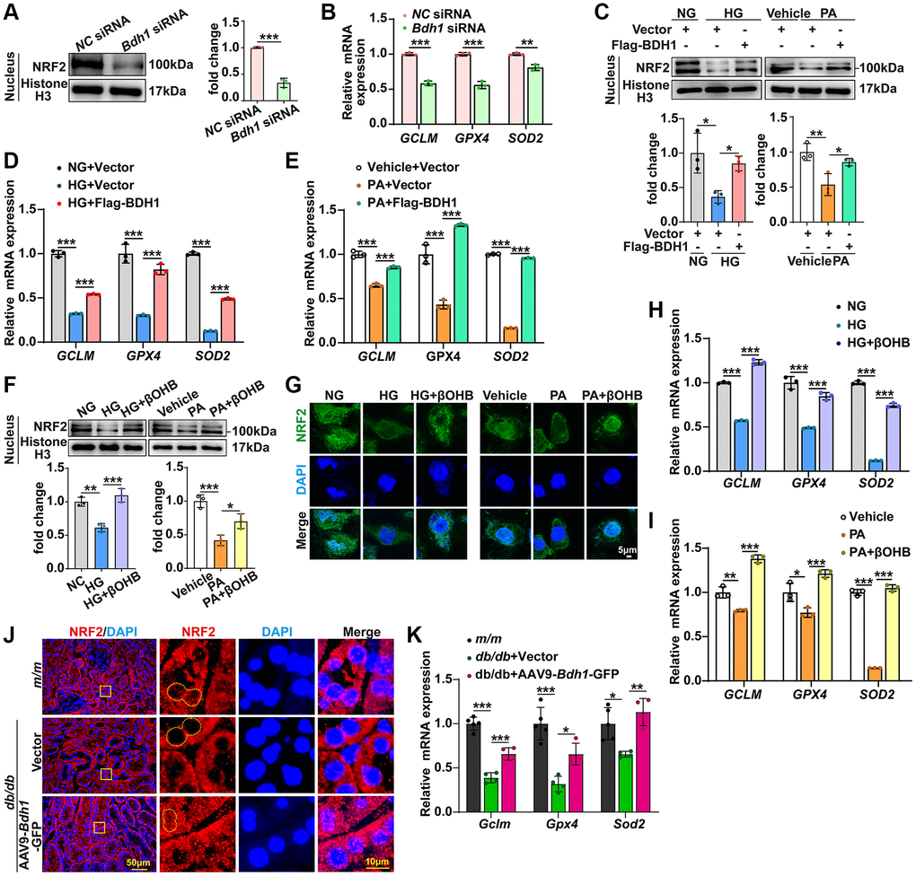 Given that NRF2 is a well-known transcription factor that regulates the transcriptional induction of antioxidant response element-containing genes encoding antioxidant enzymes in response to cellular stress, including ROS [8–10], we next attempted to determine whether BDH1 mediates anti-ROS function by activating NRF2. Because NRF2 is a nuclear transcription factor, we determined the protein levels of NRF2 in nuclear extracts using western blotting. In HK-2 cells transfected with Bdh1 siRNA, the cytoplasmic NRF2 protein levels (Supplementary Figure 5A) were significantly up-regulated while the nuclear NRF2 protein levels (Figure 4A) and downstream antioxidant genes (GCLM, GPX4, and SOD2) (Figure 4B) were significantly down-regulated compared with those in cells transfected with normal control (NC) siRNA. Moreover, both HG and PA induced a reduction in NRF2 in nuclear extracts, whereas BDH1 overexpression reversed the reduction in HG- and PA-induced NRF2 (Figure 4C) and downstream antioxidative targets (GCLM, GPX4, and SOD2) (Figure 4D, 4E). In contrast, the cytoplasmic NRF2 protein level decreased in BDH1-overexpressed HK-2 cells (Supplementary Figure 5B). Consistent with the observations for BDH1 overexpression, βOHB supplementation reversed HG- and PA-induced NRF2 reductions in nuclear extracts (Figure 4F), which was further confirmed by NRF2 nuclear translocation assay with immunostaining (Figure 4G). Similarly, the expression of NRF2 downstream antioxidant genes, GCLM, GPX4, and SOD2 was significantly decreased in both HG- and PA-induced HK-2 cells and reversed by βOHB supplementation (Figure 4H, 4I), which was consistent with the NRF2 nuclear translocation results. In contrast, the cytoplasmic NRF2 protein level was decreased in HK-2 cells supplemented with βOHB (Supplementary Figure 5C) while the NRF2 mRNA level was not affected in HK-2 cells treated with HG, PA, or βOHB (Supplementary Figure 6). Additionally, AAV9-Bdh1-GFP injection promoted nuclear translocation of NRF2 (Figure 4J) and its downstream antioxidant genes (Gclm, Gpx4, and Sod2) (Figure 4K) in the kidneys of db/db mice. These data indicate that BDH1-mediated βOHB metabolism promoted NRF2 nuclear translocation.
