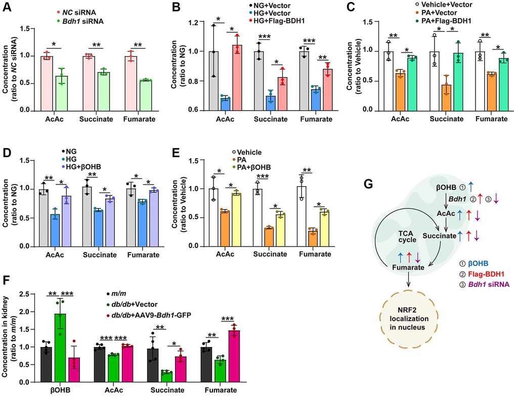In the BDH1-mediated βOHB metabolism pathway, BDH1 first metabolizes βOHB into AcAc, which can enter the TCA cycle, and then AcAc is metabolized into succinate and fumarate in turn. Since fumarate is a well-known activator of NRF2 signaling, we examined whether BDH1 activates NRF2 by increasing in fumarate levels. We identified that AcAc, succinate, and fumarate concentrations were reduced in HK-2 cells transfected with Bdh1 siRNA (Figure 5A). Similar to what was observed in Bdh1 siRNA-transfected HK-2 cells, both HG and PA treatments reduced the levels of AcAc, succinate, and fumarate, which were successfully blocked by BDH1 overexpression (Figure 5B, 5C). Similarly, βOHB supplementation reversed the HG- or PA-induced reduction of AcAc, succinate, and fumarate (Figure 5D–5E). As the substrate of BDH1, βOHB was reduced in the kidneys of AAV9-Bdh1-GFP–injected db/db mice (Figure 5F). Consistent with the results observed in HK-2 cells, the levels of AcAc, succinate, and fumarate were reduced in the kidneys of db/db mice injected with the vector, although these changes were reversed by AAV9-Bdh1-GFP injection (Figure 5F). These findings collectively reveal a metabolic flux composed of βOHB-AcAc-succinate-fumarate that could be regulated by BDH1 or βOHB and affect downstream NRF2 signaling (Figure 5G).