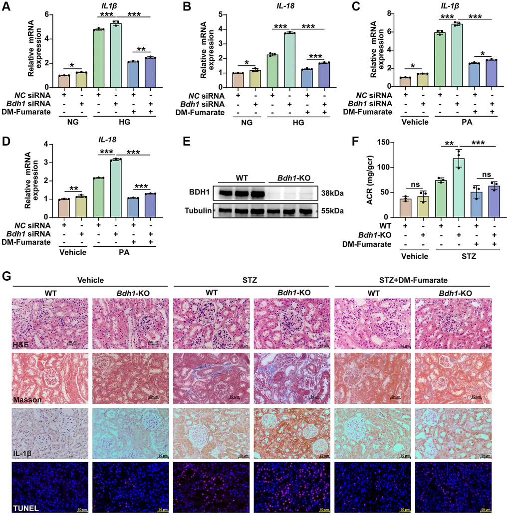 To further determine whether the decrease in fumarate-mediated Bdh1 reduction-induced aggravation of glucotoxicity and lipotoxicity, we established a glucotoxicity and lipotoxicity cell model using Bdh1 siRNA-transfected HK-2 cells in vitro and a streptozotocin (STZ)-induced diabetes mouse model using Bdh1 knockout mice in vivo, and treated them with dimethyl fumarate (DM-Fumarate). The results showed that the DM-Fumarate treatment reversed the Bdh1 knockdown-induced increase in glucotoxicity (Figure 6A, 6B) and lipotoxicity (Figure 6C, 6D) in HK-2 cells. Moreover, the DM-Fumarate treatment reversed the Bdh1 knockout-induced increase in ACR (Figure 6E, 6F) and pathological injury to the kidney (Figure 6G) in STZ-induced diabetic mice. These data indicate that Bdh1 reduction aggravates glucotoxicity and lipotoxicity by down-regulating fumarate, which provides strong support for our conclusion that Bdh1 over-expression ameliorate glucotoxicity and lipotoxicity through βOHB-AcAc-succinate-fumarate metabolic flux in DKD.
