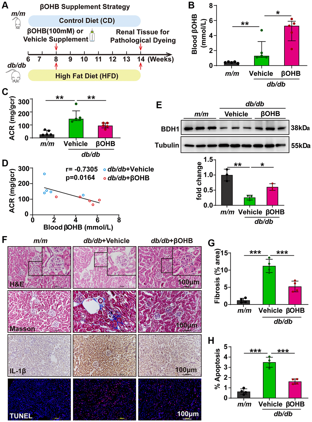 As βOHB supplementation showed a similar effect as BDH1 overexpression on HG- or PA-induced ROS overproduction and inflammation in HK-2 cells, we next attempted to determine whether βOHB supplementation could ameliorate DKD. The experimental strategy is illustrated in Figure 7A. At six weeks after supplementation of βOHB (100 mM) in drinking water, we identified the blood βOHB levels and observed an increased βOHB levels in db/db mice supplemented with βOHB (Figure 7B). Subsequently, an ACR assay was performed. Although βOHB supplementation did not affect body weight, fasting blood glucose levels (Supplementary Figure 4C, 4D), and the kidney-to-body weight ratio (Supplementary Table 3), we observed that ACR was significantly lower in db/db mice supplemented with βOHB compared with mice supplemented with vehicle (Figure 7C). Moreover, the serum level of βOHB was negatively correlated with the value of ACR, indicating a strong ACR reduction capability of βOHB in DKD (Figure 7D). We observed increased BDH1 expression in the kidneys of db/db mice treated with βOHB (Figure 7E). Further histological analysis revealed that db/db mice supplemented with βOHB showed a normal glomerular morphology whereas db/db mice supplemented with vehicle showed glomerular hypertrophy (Figure 7F). Consistent with AAV9-mediated BDH1 renal expression, DKD pathology-related fibrosis, inflammation, and apoptosis were substantially reduced by βOHB supplementation (Figure 7F–7H), whereas the expression of downstream targets of NRF2 was elevated (Supplementary Figure 7A). These results indicate that βOHB supplementation might ameliorate DKD by increasing the renal expression of BDH1, which promotes βOHB metabolism.
