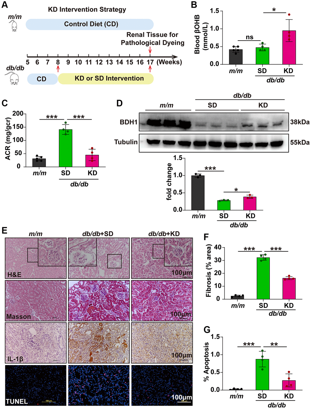 KD has been widely used in clinical studies and reported to have antidiabetic effects; however, the underlying mechanisms have not been fully described. Because KD mainly produces βOHB and BDH1-mediated βOHB metabolism plays a protective role in DKD, we next attempted to determine whether KD could ameliorate DKD and identify whether KD functions through the BDH1-mediated βOHB metabolism pathway. As shown in Figure 8A, m/m and db/db mice were fed a standard diet (SD) or KD for nine weeks starting at eight weeks of age. Although KD feeding did not affect the body weight (Supplementary Figure 4E), the fasting blood glucose levels returned to normal levels (Supplementary Figure 4F) and the kidney-to-body weight ratio was significantly reduced in KD-fed db/db mice (Supplementary Table 3). Compared with SD-fed db/db mice, KD-fed db/db mice showed increased blood levels of βOHB (Figure 8B). The KD treatment nearly completely reversed the increase in ACR in SD-fed db/db mice (Figure 8C). We observed increased BDH1 expression in the kidneys of the KD-fed db/db mice (Figure 8D). Further histological analysis showed that the KD-fed db/db mice showed significant pathological remission in the kidneys, including fibrosis, inflammation, and apoptosis (Figure 8E–8G), whereas the expression of downstream targets of NRF2 was elevated (Supplementary Figure 7B). These results indicate that KD might ameliorate DKD by increasing blood βOHB and renal expression of BDH1, which ultimately promotes βOHB metabolism.
