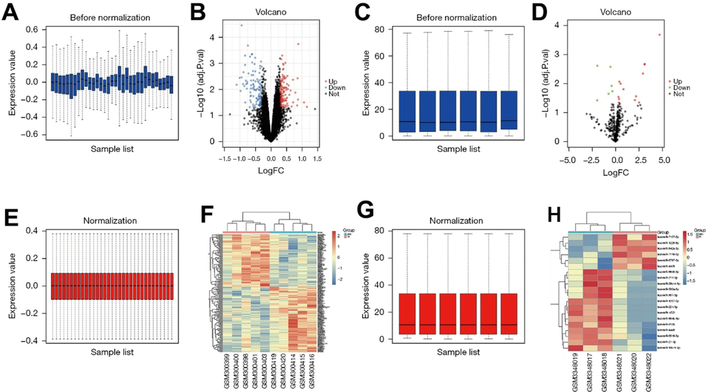 The dataset GSE11886 related to AS was downloaded from the GEO database, and the data quantiles were standardized (Figure 1A, 1E). GSE11886 was screened according to the criteria of P<0.05 and |logFC|<1. The results showed that there were 263 DEGs in the mRNAs of AS, of which 149 were up-regulated and 114 were down-regulated. The volcano plot of the dataset GSE11886 for visual grouping of DEGs was constructed in the R software using the ggplot2 package (Figure 1B), and the cluster analysis heat map of DEGs was plotted using the pheatmap package of R software (Figure 1F). In addition, the quantiles of the miRNA dataset GSE118806 were standardized (Figure 1C, 1G), and the volcano plot of GSE118806 for visual grouping of DEGs (Figure 1D) and its cluster analysis heat map (Figure 1H) were constructed using the same methods.