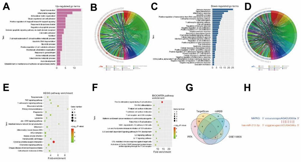 The miRNA candidate target genes were predicted using the online tools TargetScan, miRDB, and PITA. Based on these candidate target genes and the DEGs in GSE118806, a Venn diagram was drawn with the VennDiagram package to obtain the intersection and find the common binding miR-212-3p (Figure 2G). Moreover, the binding sites between mRNA and miRNA were plotted according to the gene prediction results (Figure 2H).