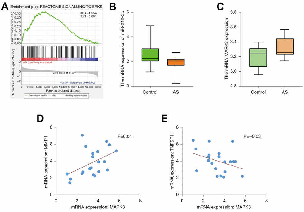 The GSEA analysis manifested that the ERK pathway and other pathways were the enrichment pathways (Figure 3A). The content of genes in different groups was subjected to statistical analysis. It was shown that miR-212 was lowly expressed in the disease group and highly expressed in the control group (Figure 3B). Meanwhile, MAPK3 was highly expressed in the disease group (Figure 3C), and the results of correlation analysis revealed that MAPK3 was correlated with MMP (Figure 3D) and tumor necrosis factor ligand superfamily member 1 (TNFSF1; Figure 3E).
