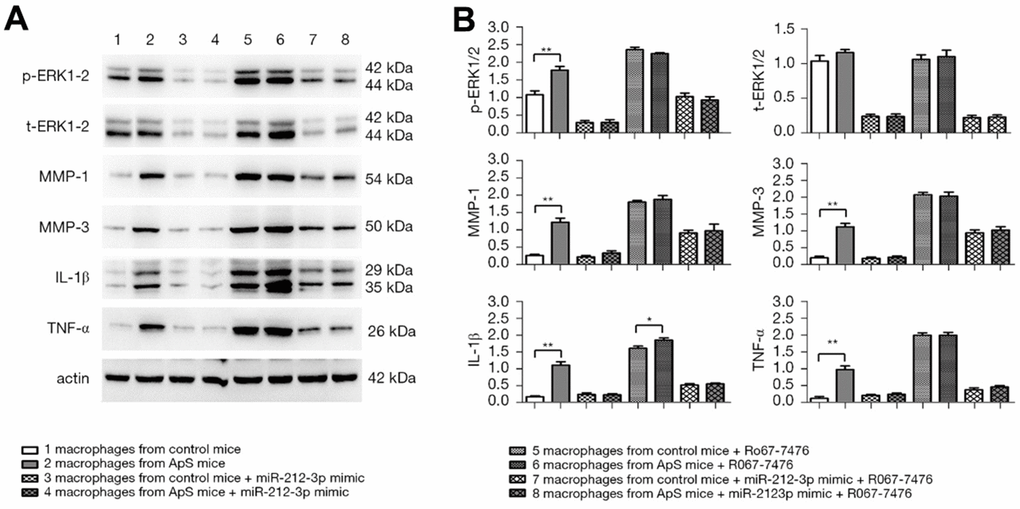 The protein expressions of p-ERK1/2, t-ERK1/2, MMP-1, MMP-3, IL-1β, and TNF-α in monocyte-macrophages were measured by western blotting (Figure 4A, 4B). The results showed that the protein expressions of p-ERK1/2, MMP-1, MMP-3, IL-1β, and TNF-α significantly rose in AS-derived monocyte-macrophages compared with those in monocyte-macrophages in normal mice. The factors all significantly declined after monocyte-macrophages from AS mice were transfected with miR-212-3p mimic. After Ro67-7476 was added, the protein expressions of p-ERK1/2, MMP-1, MMP-3, IL-1β, and TNF-α were significantly increased in each group, but they displayed decreasing trends in cells transfected with miR-212-3p mimic. The above findings suggest that miR-212-3p mimic can suppress the protein expressions of MMP-1, MMP-3, IL-1β, and TNF-α in monocyte-macrophages in AS through regulating the activation of ERK1/2.