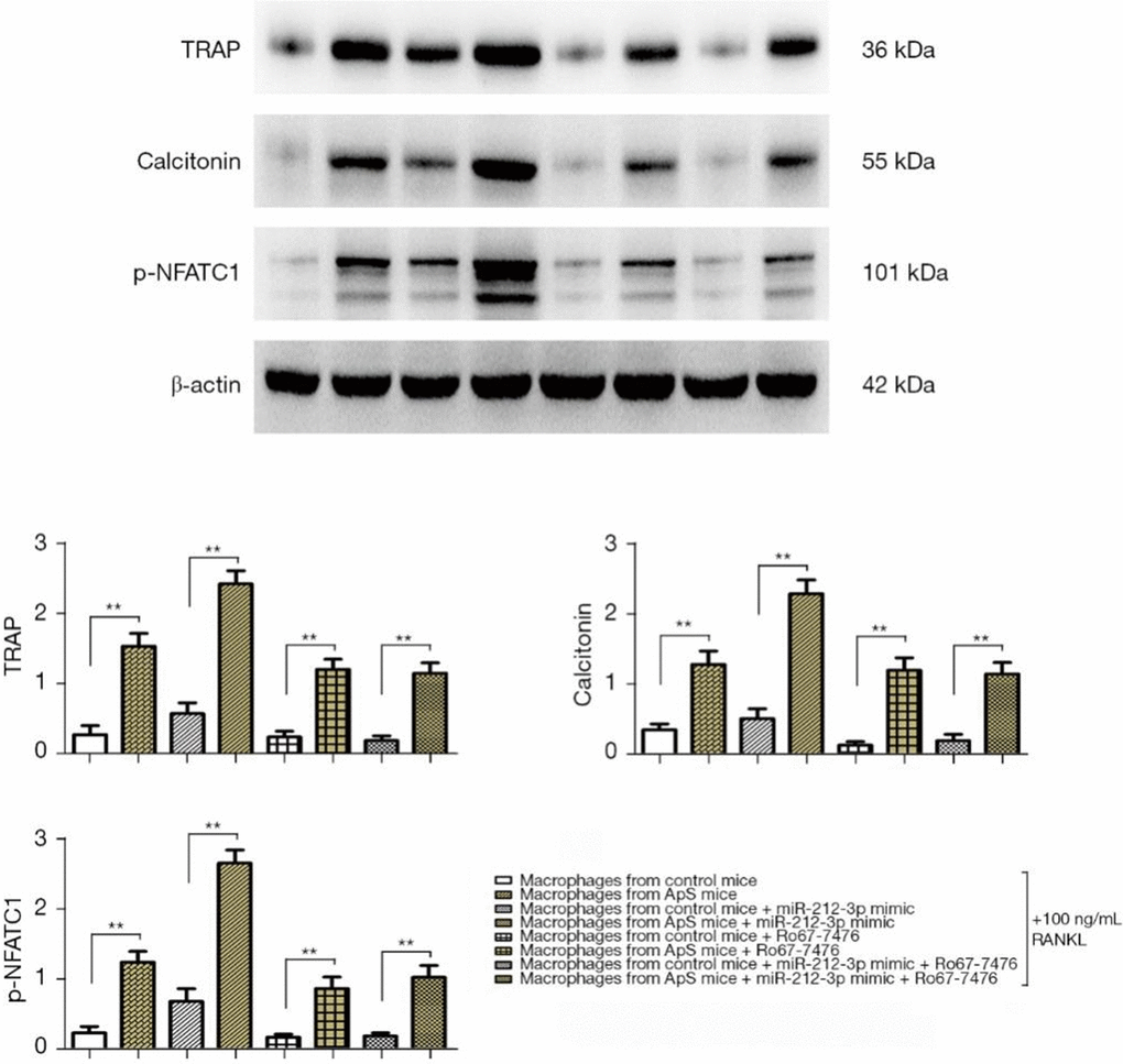 The directed differentiation of monocyte-macrophages into OCs was induced by 100 ng/mL RANKL added to the medium in each group. The results showed that the protein expressions of TRAP, calcitonin, and p-NFATC1 significantly increased in AS-derived monocyte-macrophages compared with those in monocyte-macrophages of normal mice. They all significantly rose after the cells were transfected with miR-212-3p mimic, and the factors all significantly rose in monocyte-macrophages from AS mice were transfected with miR-212-3p mimic, compared with monocyte-macrophages in normal mice were transfected with miR-212-3p mimic (Figure 5A, 5B). It can be inferred that the overexpression of miR-212-3p can facilitate the maturation and differentiation of monocyte-macrophages into OCs in AS. After Ro67-7476 was added, the protein expressions of TRAP, calcitonin, and p-NFATC1 declined, and the protein expressions of OC markers were up-regulated in monocyte-macrophages from AS mice compared with those in monocyte-macrophages of normal mice. The above findings indicate that miR-212-3p mimic may promote the directed differentiation of monocyte-macrophages into OCs in early AS by inhibiting the activation of p-ERK1/2.