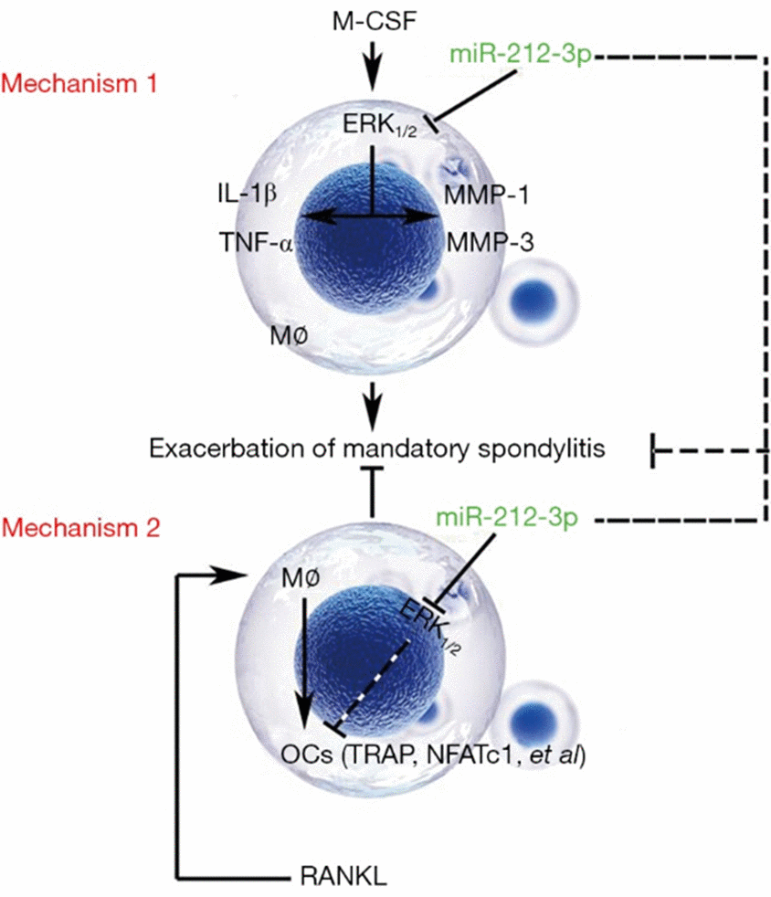 As a chronic spondyloarthritis, AS is primarily characterized by inflammation and pathological ossification [20]. Some studies have revealed that the pathological inflammation of AS has an association with bacterial infection (3), macrophage activation (4), some cytokines (5), HLA-B27 misfolding (6), and autophagy (7). Macrophages are one of the cells infiltrated at the pathogenic site of AS, and as the major cells of non-specific immune response, they are also important players in the activation of inflammatory response, immunoregulation, and inflammatory process of AS (8). In the present study, a proteoglycan-induced AS mouse model was established, and the monocyte-macrophages were cultured in vitro. The results showed that the protein expressions of IL-1β and TNF-α in monocyte-macrophages in AS mice were significantly higher than those in normal mice, and miR-212-3p mimic could inhibit the protein expressions of IL-1β and TNF-α in monocyte-macrophages in AS through regulating the activation of ERK1/2, thereby reducing the secretion of inflammatory factors (Figure 6). Monocytes in blood and bone marrow can be induced to differentiate into OCs with bone resorption activity [21]. However, whether such monocytes induced are specific remains ambiguous yet. The maturation process of such monocytes probably covers the migration and differentiation of OC precursors (cells in each stage before OC differentiation and maturation), and formation of mature OCs with bone resorption activity [22]. In this experiment, miR-212-3p mimic could down-regulate the protein expressions of MMP-1 and MMP-3 in monocyte-macrophages via suppressing the activation of ERK1/2, indicating that miR-212-3p can inhibit the aggregation and migration of macrophages, so that the bone resorption and the maturation and differentiation of OCs may be affected.