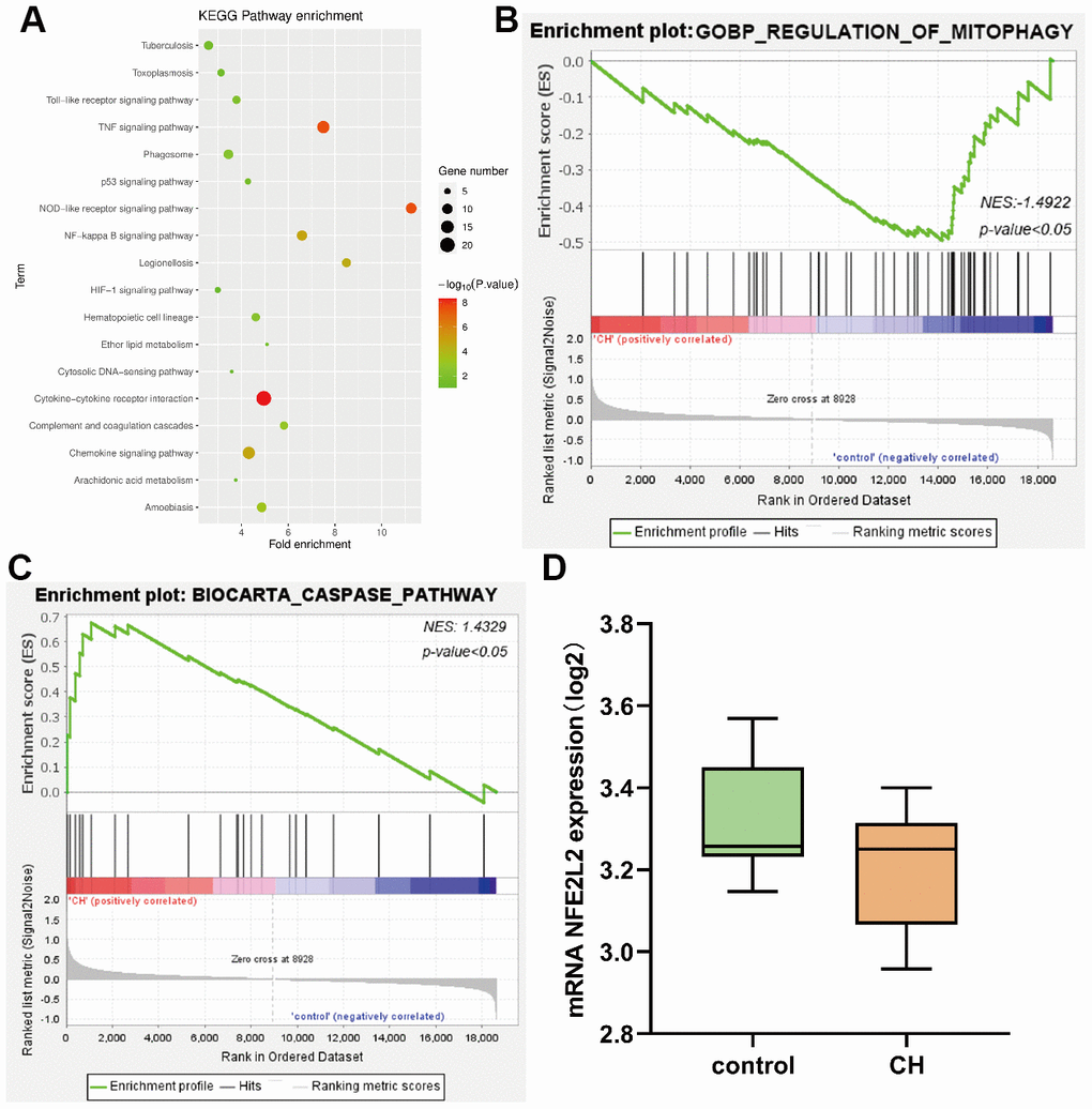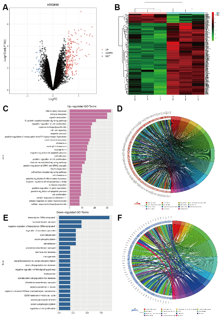 GO enrichment analysis was performed on DEGS genes using the online tool DAVID, and the up-regulation pathway map of GO was drawn using R language (Figure 2C, 2D), which indicated that the genes were enriched in inflammatory response, immune response, apoptosis pathway, etc. GO down-regulated pathways (Figure 2E, 2F), including transcription, cell adhesion, etc. Differential genes were used to analyze the KEGG pathway and draw the KEGG pathway map, which indicated that the cytokine-cytokine receptor interaction and other related pathways were enriched (Figure 3A). In addition, GSEA gene enrichment analysis revealed enrichment in mitophagy, CASPASE_PATHWAY and other pathways (Figure 3B, 3C).