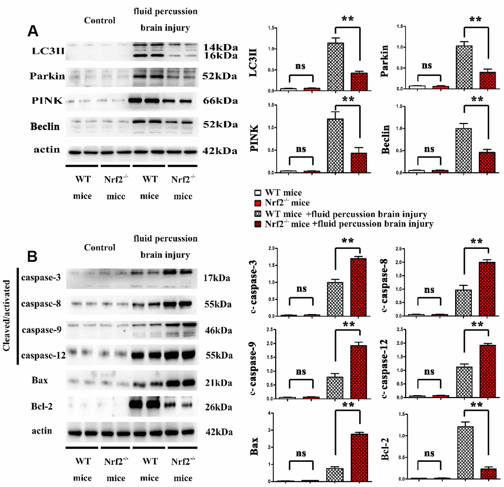 Whether Nrf2 knockout was able to affect the expression of mitophagy-related proteins and apoptosis-related proteins induced by fluid percussion brain injury in vivo was assessed by western blot. Actin was used as a loading control. Bar graphs, representative blots from four independent experiment groups were shown. Representative Western blot images and summarized data showed that Nrf2 knockout decreased the expression of mitophagy-related proteins LC3II, Parkin, Pink and Beclin, while Nrf2 knockout decreased the expression of antiapoptotic protein Bcl-2 and increased the expression of proapoptotic proteins c-caspase-3, c-caspase-8, c-caspase-9, c-caspase-12 and Bax. The data are represented as the mean ± the standard error (SEM). **, P < 0.01. The error bars represent the SEM. Statistical analysis was performed using an unpaired, two-tailed Student's t-test (Figure 4).