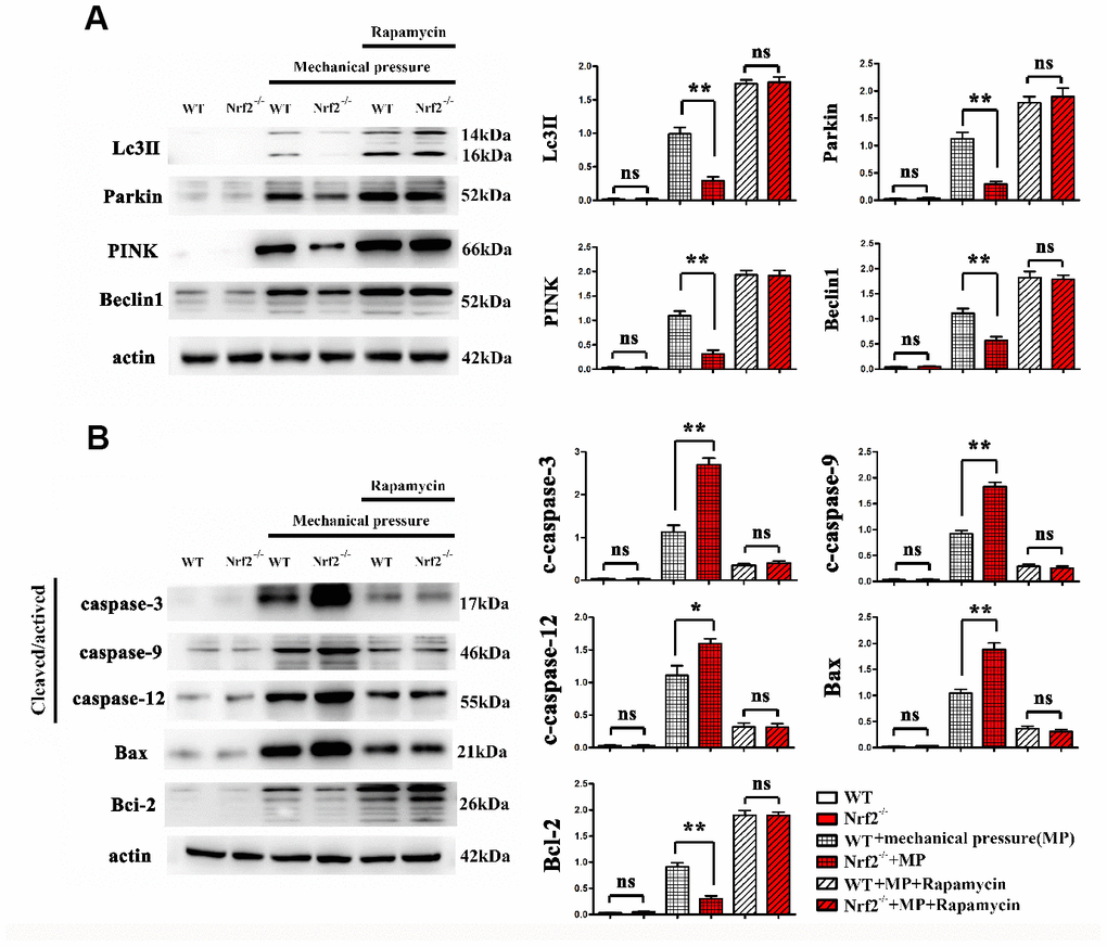 Whether Nrf2 knockout was able to affect the expression of mitophagy-related proteins and apoptosis-related proteins induced by mechanical pressure in glial cells was assessed by western blot. Actin was used as a loading control. Bar graphs, representative blots from four independent experiment groups were shown. Representative Western blot images and summary data showed that Nrf2 knockout decreased the expression of mitochondrial autophagy related proteins Lc3II, Parkin, Pink and Beclin in the mechanically damaged mouse model compared with the control group. Knockout of Nrf2 decreased the expression of anti-apoptotic protein Bcl-2, and increased the expressions of mechanical stress-induced pro-apoptotic proteins c-caspase-3, c-caspase-9, c-caspase-12 and Bax. Rapamycin is an inducer of mitophagy. Results showed that Nrf2 knockout did not affect the expression of mitophagy-related proteins and apoptosis-related proteins induced by mechanical pressure and Rapamycin in vivo. The data are represented as the mean ± the standard error (SEM). **, P < 0.01. The error bars represent the SEM. Statistical analysis was performed using an unpaired, two-tailed Student's t-test (Figure 5).