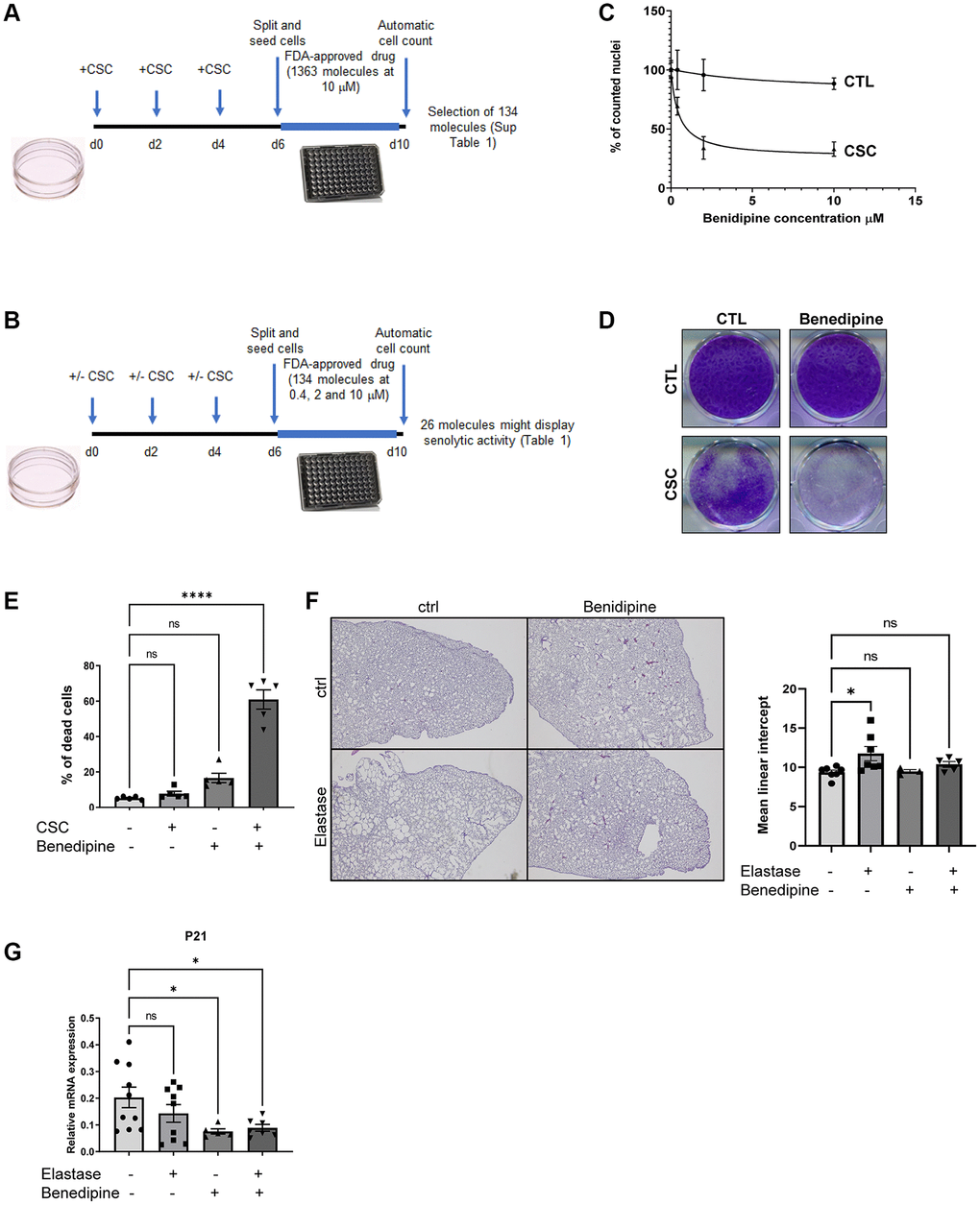 Destruction of lung parenchyma and induction of lung emphysema upon exposure to CS is mediated by elastase activity. Intra-tracheal elastase injection is thus frequently used to better understand mechanisms regulating and impacting the development of lung emphysema [19–23]. During elastase treatment, elimination of senescent cells, by ABT-263 or by depleting p19arf-positive cells, decreases emphysema [14]. Here, we assessed whether Benidipine treatment exerted similar protective effects against elastase-induced emphysema. At necropsy, lung tissues were inflated with fixative under constant pressure to avoid altering lung morphology. As expected, elastase induced a significant change in lung morphology and in the alveolar mean linear intercept, which reflects the mean alveolar size (Figure 1F). Strikingly, these lung alterations were strongly reduced when mice were treated with Benidipine (Figure 1F). This was correlated with a decrease in senescent cells according to level of p21 senescence marker (Figure 1G). Together Benidipine mimicked the effect of eliminating senescent cells during elastase-induced emphysema [14] strongly supporting that Benidipine is acting as a senolytic. We did not observe increase expression of p21 senescence marker 3 weeks after elastase treatment, suggesting that either increase of senescent cells occurred earlier or/and the increase of senescent cells was masked by complex lung remodeling after elastase treatment. These results are in line with the ones observed by [14]. It will also be interesting to extend these observations in the future in additional model of lung emphysema such as during CS exposure or during aging.