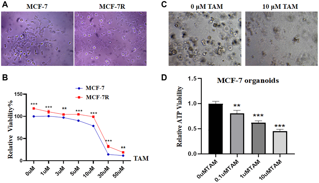 MCF-7R cells were successfully induced using a continuous induction technique with low concentrations of TAM. By inverted microscopy, we found that compared to the control group, the tamoxifen-resistant cell line had a more rounded, nearly spherical appearance, whereas the control group was spindle-shaped, showing a significant difference (Figure 1A). After CCK-8 experiments, the results showed that the cell proliferation rate of the resistant strain was significantly higher than that of the parental cell line under the same concentration of TAM treatment (Figure 1B, **P < 0.01, ***P < 0.001), a result that provides important clues for further studies on TAM resistance in breast cancer. The results of the ATP activity assay showed that 10 μM tamoxifen inhibited the cell growth of MCF-7-like organoids, and the breast cancer-like organoids were lysed and killed (Figure 1C). The level of ATP energy expression in MCF-7-like organs decreased significantly with increasing tamoxifen concentration (Figure 1D, **P < 0.01, ***P < 0.001).