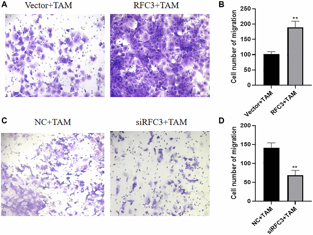 Metastasis of tumors is one of the markers of tamoxifen treatment resistance. Therefore, we further investigated the effect of RFC3 expression level on the migratory ability of TAM-resistant cells. By Transwell migration assay, we examined the changes of cell migration ability before and after RFC3 overexpression in MCF-7 and before and after RFC3 knockdown in MCF-7R, respectively. The results showed that the number of cells penetrating the bottom of Transwell was significantly increased in MCF-7 with RFC3 overexpression compared to the control group (Figure 10A, 10B, **P < 0.01). The number of cells penetrating the bottom of Transwell was significantly decreased in the MCF7-R group with RFC3 knockdown compared to the control group (Figure 10C, 10D, **P < 0.01). It indicates that the expression of RFC3 in ER-positive breast cancer TAM-resistant cells affects the migration ability of breast cancer cells, and the migration ability of breast cancer cells was enhanced when RFC3 was overexpressed, while the migration ability of breast cancer resistant cells was reduced after RFC3 was knocked down.