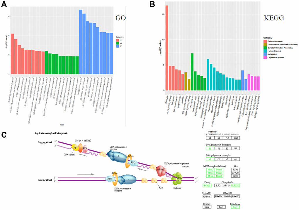 The transcriptome sequencing analysis after tamoxifen treatment of MCF-7-like organs showed the highest number of cell cycle genes, and the GO bioprocess and KEGG cellular processes suggest that multiple signaling pathways in invasive breast cancer work together to regulate breast cancer progression, with the most significant involvement of the cell cycle approach (Figure 2A, 2B). The KEGG pathway map revealed that genes such as RFC3, RFC5 and PCNA are involved in the cell cycle pathway through deoxyribonucleic acid replication (Figure 2C).