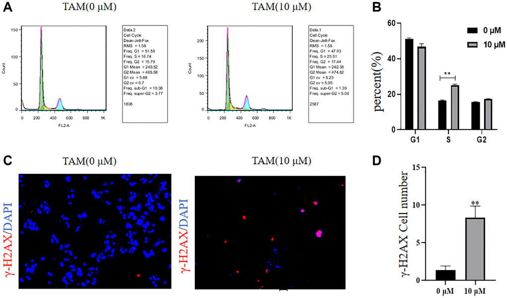 We used a flow cycle assay to show that the S-phase of MCF-7 cells was increased and the cell cycle was significantly inhibited at 10 μM tamoxifen concentration compared to the control (Figure 3A, 3B, **P < 0.01). Assays using IF showed that γ-H2AX protein expression levels were significantly increased in MCF-7 cells at a TAM concentration of 10 μM compared to those at 0 μM, indicating that TAM caused damage to the DNA of MCF-7 cells (Figure 3C, 3D, **P < 0.01).
