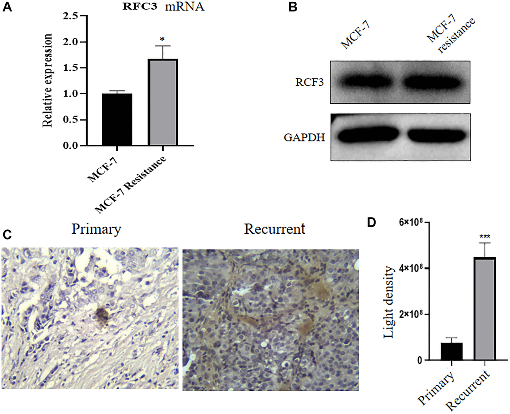 The expression of RFC3 in primary and recurrent ER+ breast cancer tissues was studied by immunohistochemical analysis. Wax block sections were dewaxed using xylene before being subjected to hydrogen peroxide, citrate buffer, treated sections and heated for antigen repair. The primary antibody of the mouse monoclonal anti-RFC3 was then incubated and treated with phosphate buffer, and the secondary antibody was added. The sections were then retreated by dropwise addition of DAB chromogenic solution, stained using hematoxylin and rinsed with water after staining. The sections were then dehydrated in ethanol and xylene and sealed with neutral gum. Finally, the sections were observed with a microscope and photographed, and the average RFC3 expression intensity was calculated using ImageJ.