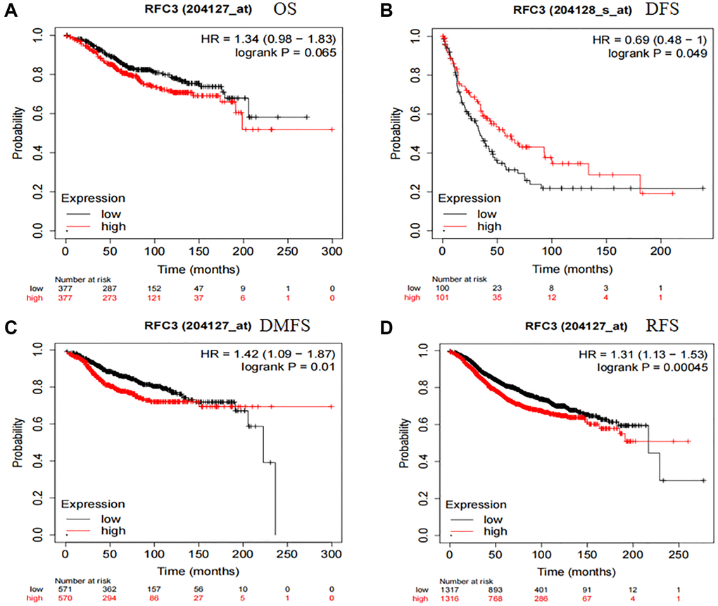 We then investigated the prognostic impact of RFC3 on patients with ER-positive breast cancer. The online Kaplan-Meier Plotter database (http://kmplot.com/analysis) was used to analyze the association between RFC3 expression levels and overall survival (OS), disease-free survival (DFS), disease-free survival (DFS), and distant metastasis-free survival (DMS) in ER-positive breast cancer patients), distant metastasis-free survival (DMFS) and relapse-free survival (RFS). The samples were divided into high and low expression groups based on the median cutoff value of RFC3 expression in ER-positive breast cancers. The results are shown in Figure 6. The level of RFC3 expression did not affect OS (HR 1.34, 95% CI 0.98–1.83, P = 0.065) and DFS (HR 0.69, 95% CI 0.48–1, P = 0.049) (Figure 6A, 6B). In contrast, patients with high RFC3 expression levels had worse DMFS (HR 1.42, 95% CI 1.09–1.87, P = 0.01) and RFS (HR 1.31, 95% CI 1.13–1.53, P = 0.00045) (Figure 6C, 6D).