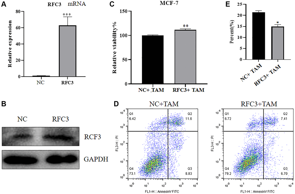 To investigate the expression, proliferation and apoptosis of mRNA and protein in MCF-7 cells after upregulation of RFC3 levels in ER-positive breast cancer cells, we used qPCR and western blot assays to show that mRNA and protein expression levels were increased in RFC3-overexpressing MCF-7 cells after transfection of RFC3 overexpression plasmids compared to controls (Figure 7A, 7B, ***P < 0.001). Using the CC-K8 assay, it was found that the proliferation rate of RFC3-overexpressing MCF-7 cells was significantly increased compared to that of the control group, and the inhibitory effect of tamoxifen on the proliferation of RFC3-overexpressing MCF-7 cells was diminished compared to that of the control group (Figure 7C, **P < 0.01). Using a flow cytometric assay, it was found that the proportion of apoptotic death in RFC3-overexpressing MCF-7 cells was less than that in the control group, indicating that the pro-apoptotic effect of tamoxifen on RFC3-overexpressing MCF-7 cells was diminished compared to the control group (Figure 7D, 7E, *P < 0.05).