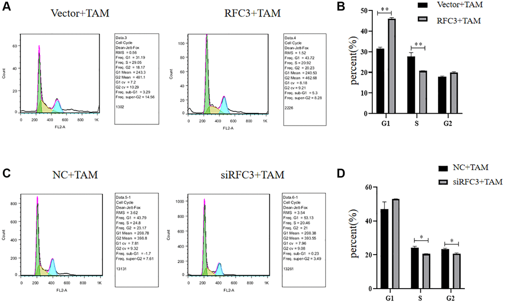 To investigate whether the cell cycle inhibition of ER-positive breast cancer cells by TAM is affected by the level of RFC3 expression, we showed by flow cytometric cell cycle assay that, compared with the control group, the proportion of MCF-7 cells in S-phase decreased and the proportion of MCF-7 cells in G1-phase increased after RFC3 overexpression in MCF-7 cells treated with TAM. The proportion of S-phase and G1-phase was decreased and cell cycle inhibition was reduced in RFC3 overexpressed MCF-7 cells compared to control cells (Figure 9A, 9B, **P < 0.01), whereas the proportion of S-phase and G2-phase was decreased and cell cycle inhibition was enhanced in RFC3 knockdown treated MCF-7R resistant cells by TAM compared to control cells by siRNA transfection (Figure 9C, 9D, *P < 0.05).