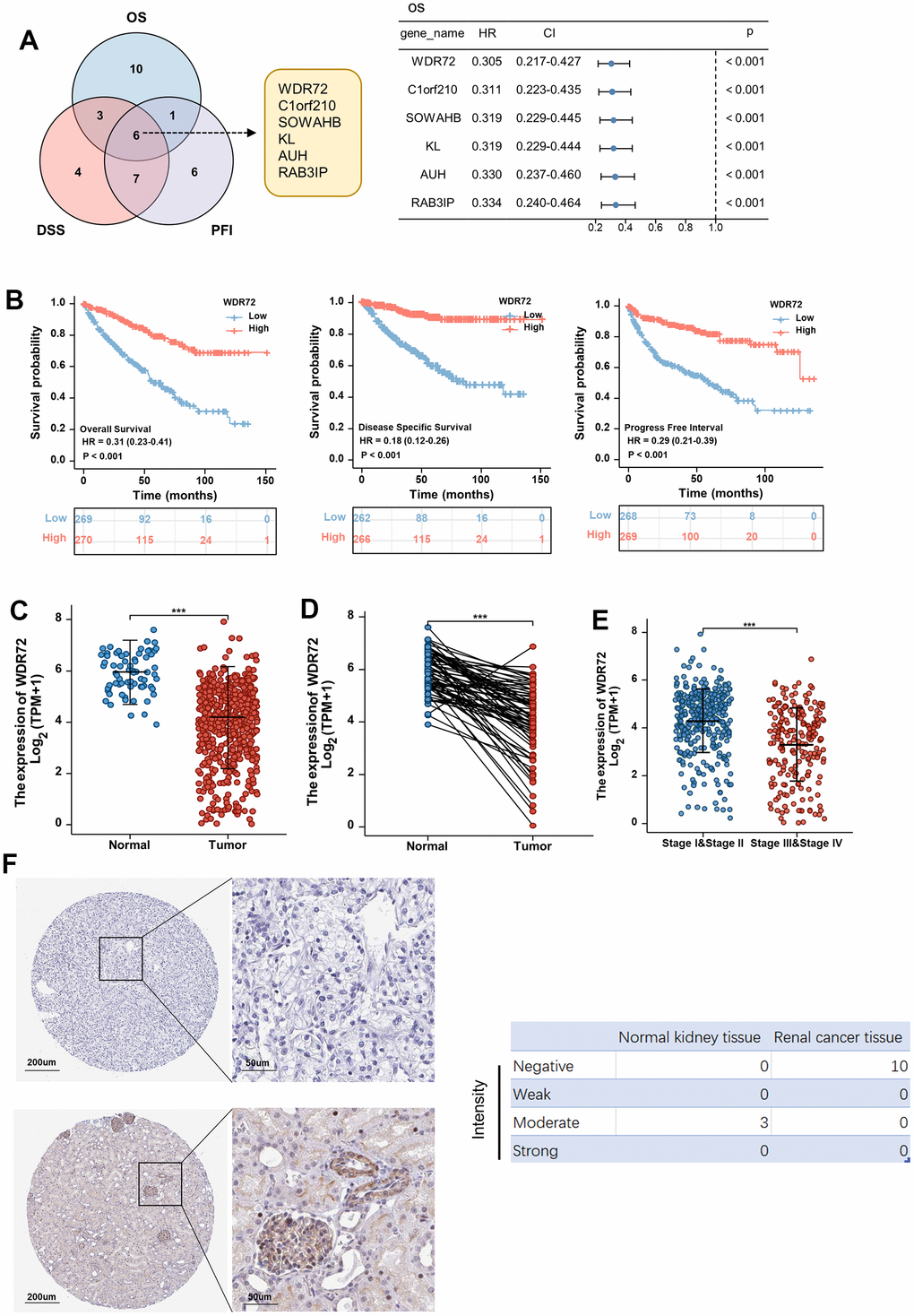 First of all, we screened the top 20 genes that are conducive to the prognosis of ccRCC based on TCGA database, including OS, DSS and PFI. Six overlapping genes, WDR72, C1orf210, SOWAHB, KL, AUH, and RAB31P, could improve the above three indicators of prognosis. Cox regression analysis for OS showed that WDR72 had more notable prognostic significance than other genes (HR=0.305, P<0.001; Figure 1A), and the effect of these six genes on PFI and DSS were also exhibited (Supplementary Figure 1). Kaplan-Meier and log-rank analysis further proved that WDR72 can be used as an important prognostic indicator in ccRCC, and high expression of WDR72 predicted favourable OS, DSS and PFI (Figure 1B). The analysis result of GSE22541 dataset was consistent with the above results, and ccRCC patients with low expression of WDR72 had worse DFS than those with high expression of WDR72 (HR=2.60, P=0.004; Supplementary Figure 5A). What’s more, the expression of WDR72 gene and protein in tumors was significantly lower than that in normal tissues (Figure 1C, 1D, 1F) and the expression level of WDR72 gene in advanced tumors was significantly lower than that in early stage (Figure 1E).