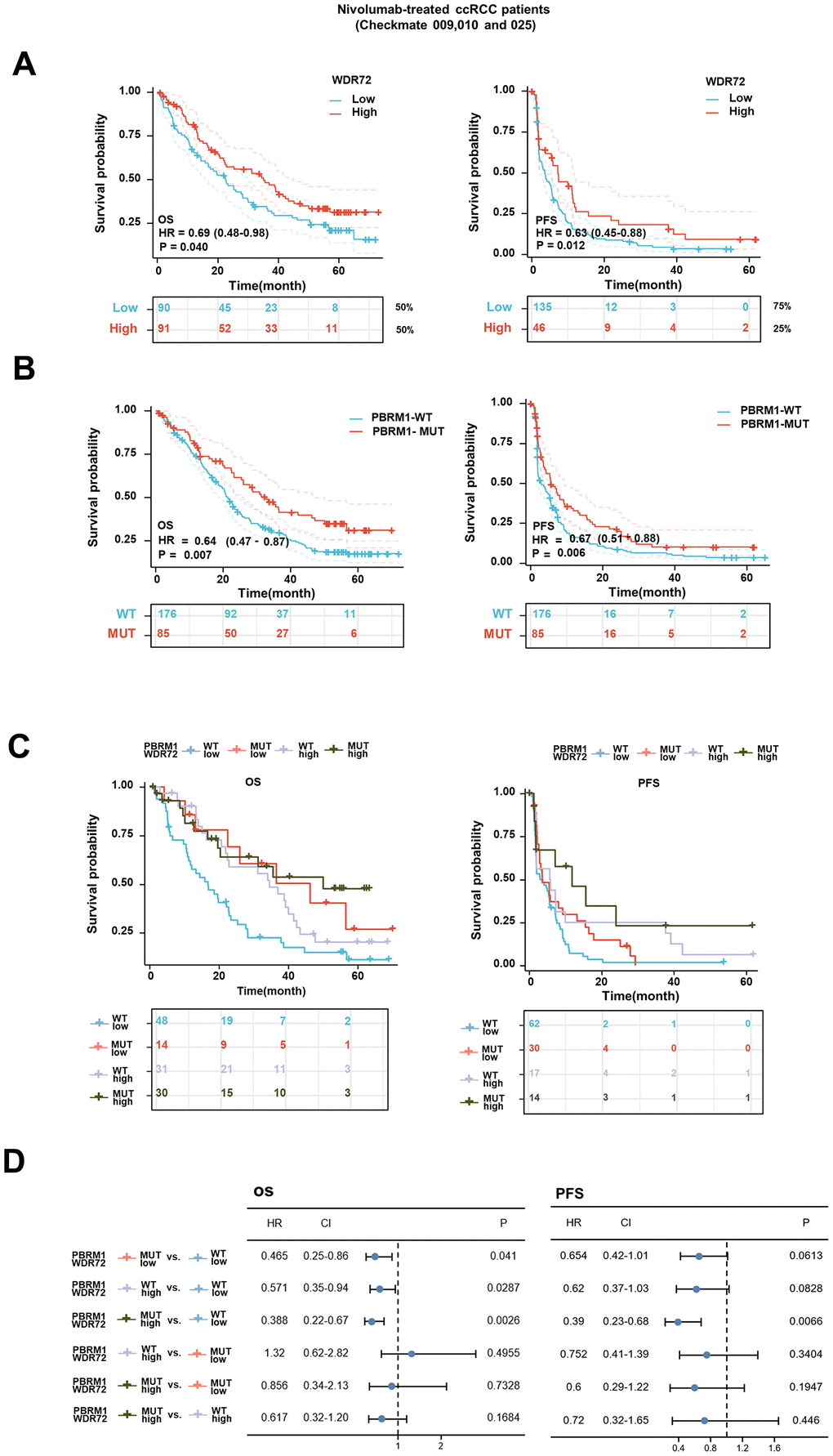 Considering that WDR72 was a significant indicator for prognosis of ccRCC, we investigated the relationship between the expression level of WDR72 and the outcome of ccRCC patients treated with Nivolumab, a classical drug of immune checkpoint inhibitor (ICI). The results showed that in low WDR72 expression group, the therapeutic effect was worse than that in high WDR72 expression group, which indicated that WDR72 can effectively predict the response to Nivolumab (OS, HR=0.69, P=0.040; PFS, HR=0.63, P=0.012) (Figure 2A). However, the expression level of other overlapping five genes except SOWAHB fell to predict OS of patients that had received Nivolumab therapy (Supplementary Figure 2). We already know that patients with PBRM1-MUT have better OS and PFS than those with PBRM1-WT in Nivolumab treated Checkmates (OS, HR=0.64, P=0.007; PFS, HR=0.67, P=0.006) (Figure 2B). Although WDR72 expression is elevated in patients with PBRM1-MUT, there is no significant correlation between WDR72 and PBRM1 expression. Notably, the expression of WDR72 was lower in immune infiltrated patients than in immune desert, but WDR72 expression was not associated with clinical benefit. Therefore, we combined PBRM1 mutation status with WDR72 expression stratification to explore indicating effect of different combinations on Nivolumab response (Supplementary Figure 3). PBRM1-MUT with high WDR72 expression versus PBRM1-WT with low WDR72 expression showed the lowest HR for OS (HR=0.388, P=0.0026) and PFS (HR=0.39, P=0.0066), suggesting that the mutation of PBRM1 combined with high expression of WDR72 can better predict the response to Nivolumab treatment (Figure 2C, 2D).
