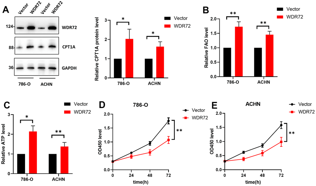 For the sake of exploring the mechanism of WDR72 in ccRCC, GO, KEGG and GSEA analysis were performed. GO & KEGG results showed that WDR72 is related to fatty acid metabolism (Figure 3A, 3B), and GSEA analysis further proved that WDR72 may influence the progression and prognosis of ccRCC by regulating the fatty acids beta oxidation (Figure 3C). In addition, six overlapping genes related to both lipid degradation pathway and fatty acids β oxidation pathway were excavated, including ACAT1, CPT1A, CPT2, ACSL1, HADHB, and ACADM (Figure 3D). What’s more, we found that the expression of WDR72 was also positively correlated with the above six genes in GSE22541 dataset (all P<0.01; Supplementary Figure 5D, 5E). Among them, the CPT1A, as a key gene in fatty acids beta oxidation, was significantly positively correlated with WDR72 gene (r=0.764, P <0.001; Supplementary Figure 5F). Then, we conducted cell experiments to validate above results. After the construction of plasmids (oe-Vector and oe-WDR72), Western blotting was performed to validate the efficiency of these plasmids, and along with the overexpression of WDR72, CPT1A, the key enzyme of fatty acids oxidation, was also significantly increased (Figure 4A). In addition, produced ATP and FAO level in 786-O and ACHN cells transfected with oe-WDR72 were higher than control group (Figure 4B, 4C). Then, a CCK8 assay was performed to verify the effect of WDR72 on the proliferation viability of ccRCC cells. The results indicated that the proliferation of 786-O and ACHN cells were significantly inhibited by overexpression of WDR72 compared to the control group (Figure 4D, 4E).