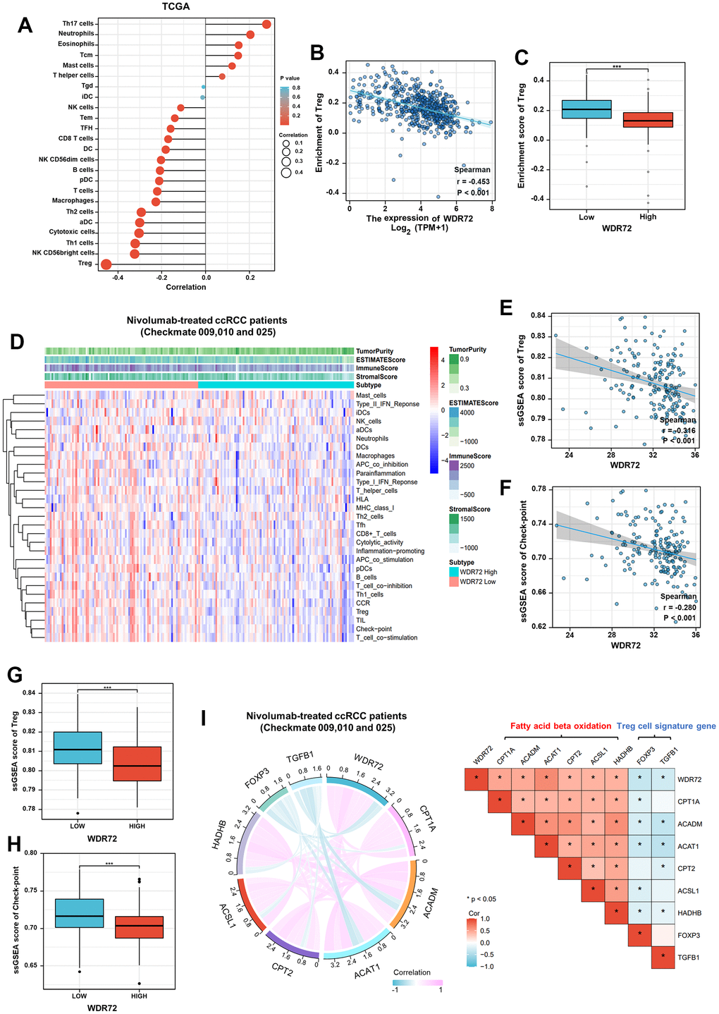 Generally, the therapy effect of ICI on ccRCC patients is closely related to tumor immune microenvironment. Therefore, we performed immune status and tumor microenvironment analysis to further explore the role of WDR72 in response to ICI based on TCGA database and three clinical trials. Analysis results from TCGA showed that the expression of WDR72 was negatively related to Treg cells infiltration which was reported to inhibit tumor immunity and contribute to tumor progression (Figure 5A–5C). Heatmap of the ssGSEA scores presented the tumor purity, ESTIMATE score, immune score, and stromal score of each sample in Nivolumab-treated ccRCC patients (Figure 5D). Similarly, high WDR72 expression decreased the infiltration of Treg cells in the patients receiving treatment of Nivolumab (Figure 5E, 5G). In addition, WDR72 was negatively related to check-point pathway and the ssGSEA score of check-point was significantly lower in WDR72 high expression group (Figure 5F, 5H). Moreover, WDR72 expression was positively correlated with pivotal genes of fatty acid beta oxidation while both WDR72 and key genes of fatty acid beta oxidation were negatively related to the expression of Treg cell signature genes (FOXP3 and TGFB1) in Nivolumab-treated ccRCC subpopulation (Figure 5I).