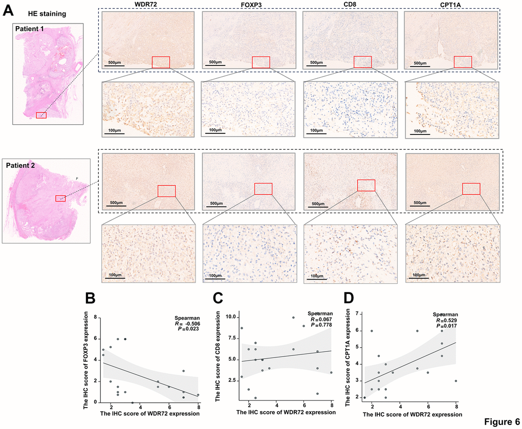 To further verify the effects of WDR72 expression on the fatty acids beta oxidation and Treg cell infiltration. We examined the expression of WDR72 and biomarkers (FOXP3, CD8, CPT1A) in 20 advanced ccRCC tissues by the H&E staining and IHC staining (Figure 6A). The IHC results showed a significant correlation between the expression levels of WDR72 and CPT1A (r=0.529, P<0.017; Figure 6D), as well as WDR72 and FOXP3 (r=-0.512, P=0.023; Figure 6B). In addition, no significant correlation was found between CD8 and WDR72 expression (r=-0.067, P=0.778; Figure 6C).