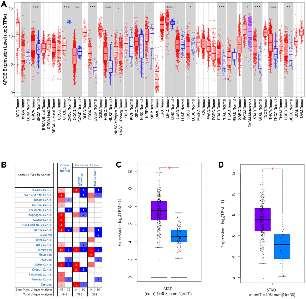 To examine APOE transcriptome level in diverse human cancers, we conducted an analysis using TIMER (Figure 1A) and Oncomine (Figure 1B). Our findings revealed that APOE exhibited significantly higher expression in several cancer tissues, including stomach adenocarcinoma (STAD). Subsequently, we quantitatively examined the transcription levels of APOE in GC, based on sequencing data obtained from the TCGA database. Consistently, we observed up-regulation of APOE mRNA in GC tissues (Figure 1C, 1D).