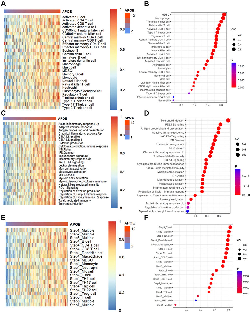 It is well known that the survival of GC is linked to the activation and infiltration of immune cells in the tumor microenvironment (TME). Previous studies have reported APOE enhances the migration of GC cells by being transferred from TAMs to GC cells [23]. Hence, we aimed to investigate the connection between APOE level and immune cells abundance. As depicted in Figure 5A, immune cell scores tended to increase with higher APOE mRNA expression levels. We applied Spearman’s correlation analysis to assess the connection of APOE transcriptome level and immune cells, revealing significant correlations with T cells, B cells, Macrophages, and DCs (Figure 5B). Moreover, we examined the connection between APOE transcriptome level and immune phenotypes, as depicted by a heat map showing a positive trend between immune phenotypes and APOE mRNA expression level (Figure 5C). The correlation analysis further highlighted close associations between APOE mRNA level and tolerance induction (r = 0.68, P < 0.0001), PDL1 signaling (r = 0.61, P < 0.0001), antigen processing and presentation (r = 0.60, P < 0.0001), adaptive immune response (r = 0.59, P < 0.0001), and JAK STAT signaling (r = 0.57, P < 0.0001) (Figure 5D). Moreover, we evaluated the impact of APOE mRNA expression on the cancer immunity cycle, which encompasses seven critical steps representing the anticancer immune response. In subgroups with higher APOE mRNA expression, most steps of the cancer immune cycle are activated (Figure 5E, 5F).