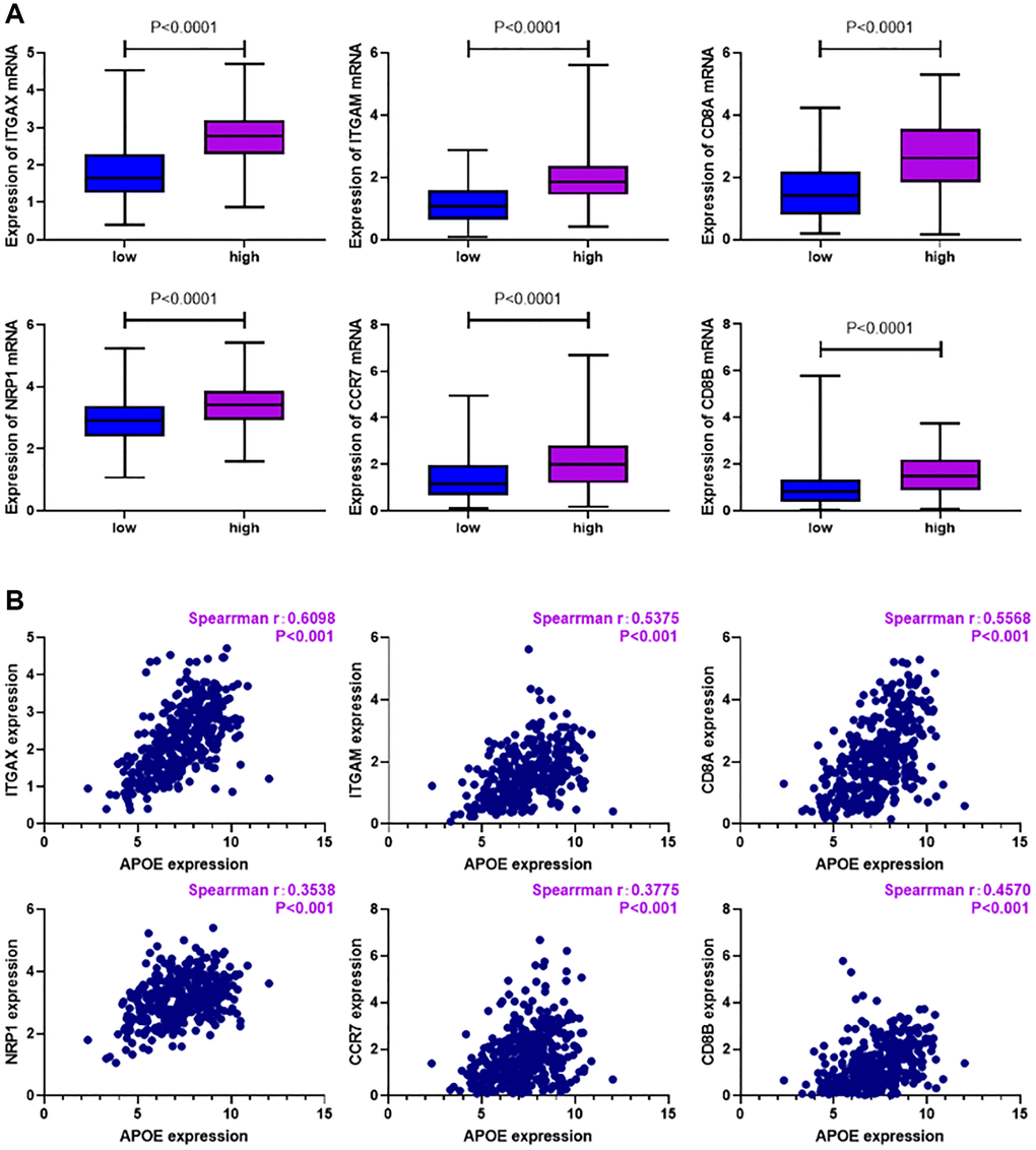 In addition, we sought to assess the connection between APOE transcriptome level and specific markers of immune cells. Notably, we investigated the expression levels of ITGAX and NRP1 as dendritic cell (DC) markers, ITGAM and CCR7 as neutrophil markers, as well as CD8A and CD8B as markers for CD8+ T cells. Our results, as illustrated in Figure 7A, revealed a substantial increase in the levels of ITGAX, NRP1, ITGAM, CCR7, CD8A, and CD8B within the APOE high group in comparison to the APOE low group (P < 0.0001). This observation emphasizes the potential association between APOE and these immune cell markers in GC. Furthermore, through correlation analysis, we demonstrated a positive correlation between the mRNA expression level of APOE and ITGAX, NRP1, ITGAM, CCR7, CD8A, and CD8B in GC (Figure 7B) (P < 0.0001). These findings further emphasize the potential role of APOE in influencing the level of these markers of immune cells in GC.