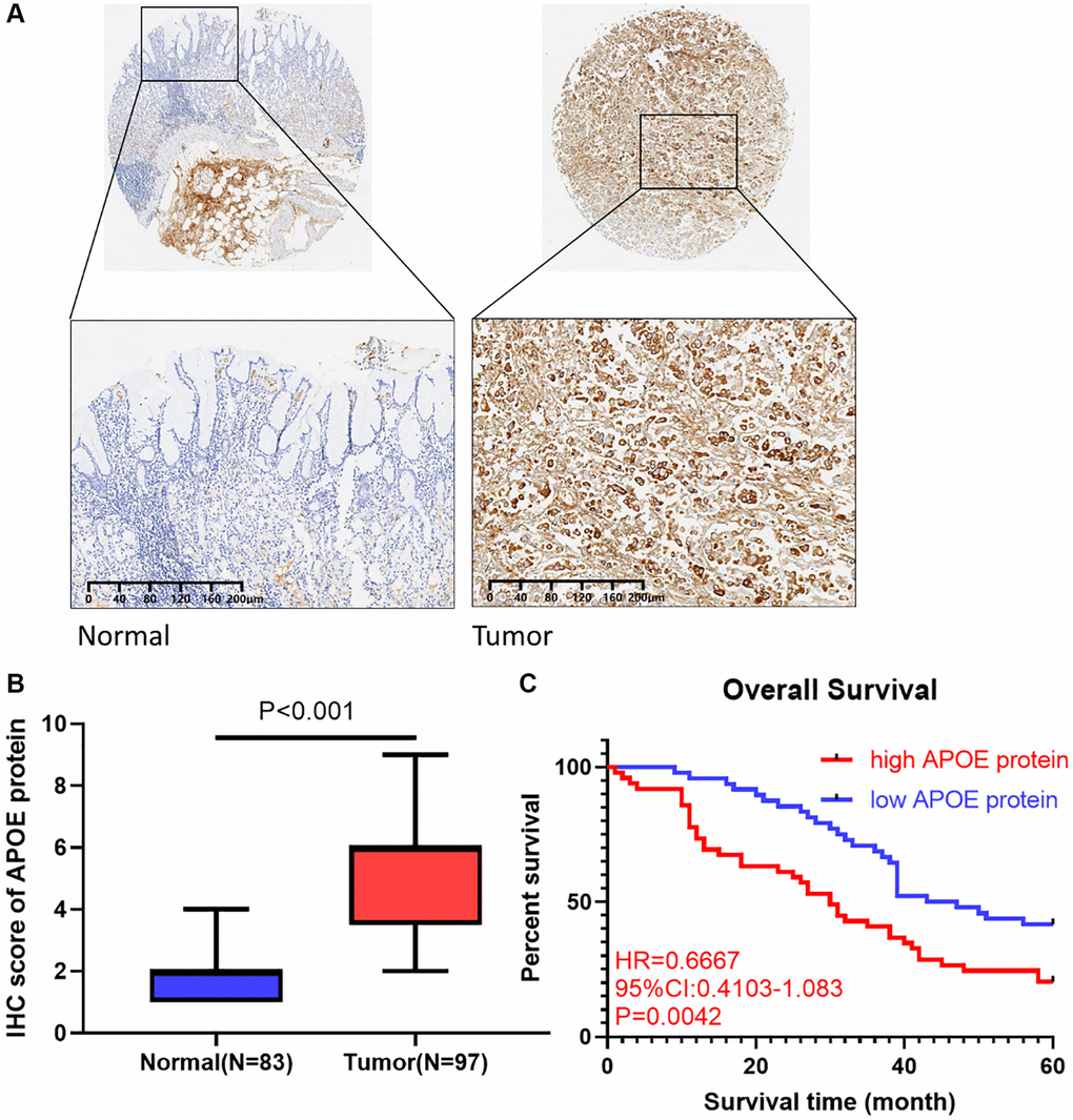 To ascertain APOE protein expression pattern in GC, we employed a cohort comprising 97 GC tissues obtained from Shanghai Qutdo Biotech Company. Through semiquantitative analysis, we observed a remarkable increase in the intensity of APOE staining in GC tissues (Figure 8A, 8B), indicating a potential role for APOE in the development or progression of GC.