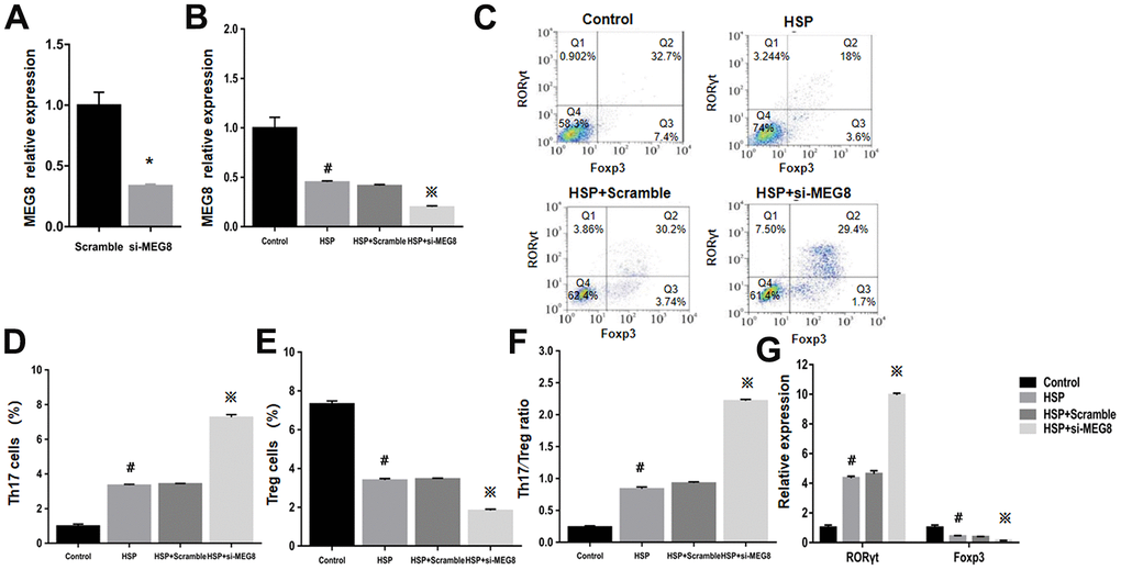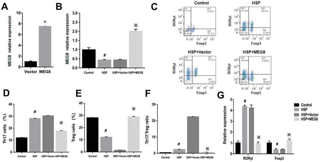 MEG8 function within Th17/Treg ratio regulation for HSP was examined by constructing an MEG8 overexpression vector, which was transfected into peripheral blood CD4+ T cells derived from the control and HSP groups (Figure 2). The efficiency of MEG8 overexpression in CD4+ T cells from HSP rats was significantly reduced compared to the controls (Figure 2A). MEG8 was upregulated obviously in CD4+ T cells in HSP rats (Figure 2B). However, the overexpression of MEG8 reversed the Th17/Treg ratio imbalance in CD4+ T cells of HSP rats. Furthermore, a higher proportion of Th17 cells (Figure 2C, 2D), a lower proportion of Treg cells (Figure 2C, 2E), and a higher proportion of Th17/Treg cells (Figure 2F) were observed compared to the controls. Also, the mRNA level of ROR-γt was upregulated, while that of Foxp3 was downregulated in CD4+ T cells of HSP rats. (Figure 2G).