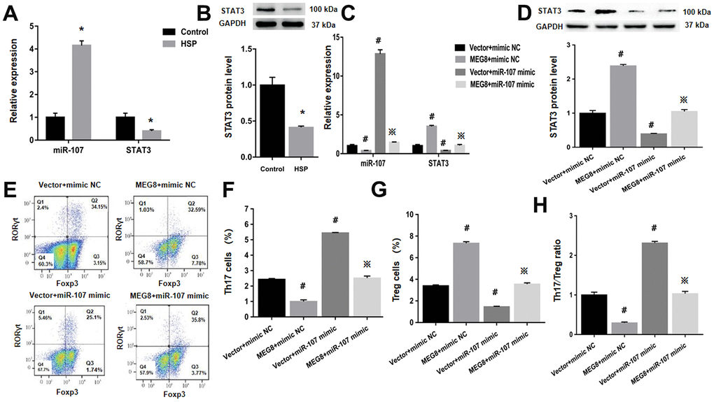MEG8 as a ceRNA may increase the expression of STAT3 by miR-107, thereby restoring the Th17/Treg imbalance rats. Thus, this study confirmed HSP has a putative therapeutic target.