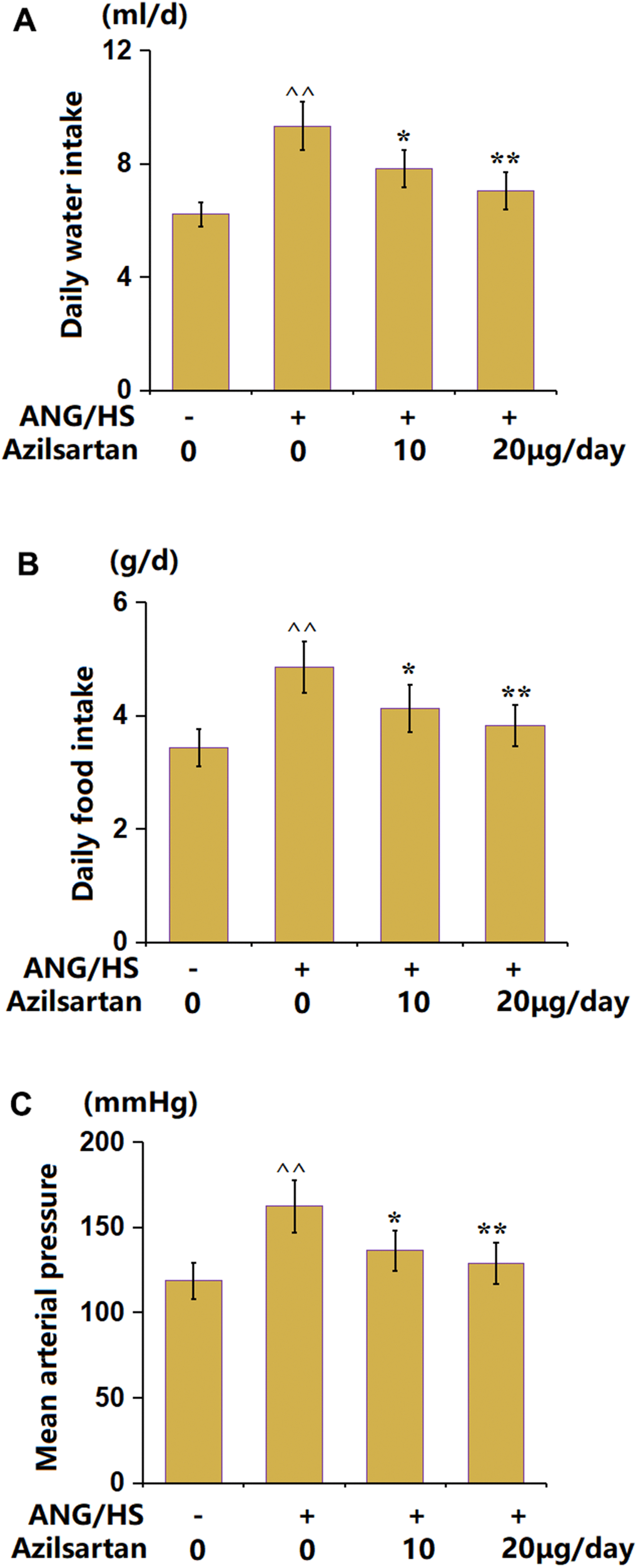 8-week mice were divided into four groups: Control, angiotensin and high-salt (ANG/HS), ANG/HS + Azilsartan (10 μg/day, Cat#:ajci10796, Amgucam, Shanghai, China), and ANG/HS + Azilsartan (20 μg/day) groups for 3 weeks. To construct the ANG/HS model in mice, animals were implanted with an osmotic minipump to administer 60 ng/min ANG for 14 days. During the administration, the HS diet (8% NaCl) was given to mice. After the modeling, mice were dosed with 10 μg/day or 20 μg/day Azilsartan for 3 weeks. The daily water intake, food intake, and mean arterial pressure were detected during the treatments [21].