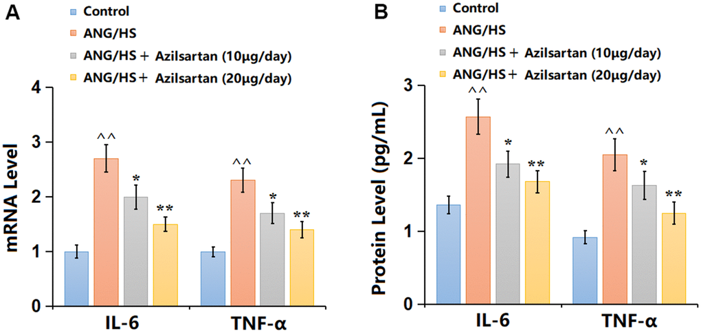 Renal tissues were then extracted for inflammation detection. IL-6, TNF-α, and IL-1β levels were extremely increased in the ANG/HS group, but signally reduced by 10 and 20 μg/day Azilsartan (Figure 2A). Furthermore, the IL-6 level (Figure 2B) in the ANG/HS group was promoted from 1.83 to 3.11 pg/mL, then decreased to 2.38 and 1.78 pg/mL by 10 and 20 μg/day Azilsartan, respectively. Similarly, the TNF-α levels in the control, ANG/HS, ANG/HS+ Azilsartan (10 μg/day), and ANG/HS + Azilsartan (20 μg/day) groups were 1.06, 2.26, 1.76, and 1.37 pg/mL, respectively. Moreover, The expressions of IL-1β in the control, ANG/HS, ANG/HS+ Azilsartan (10 μg/day), and ANG/HS + Azilsartan (20 μg/day) groups were 1.69, 3.58, 2.45, 1.89 pg/mL, respectively. Azilsartan showed a suppressive impact on inflammatory response in ANG/HS-challenged mice.