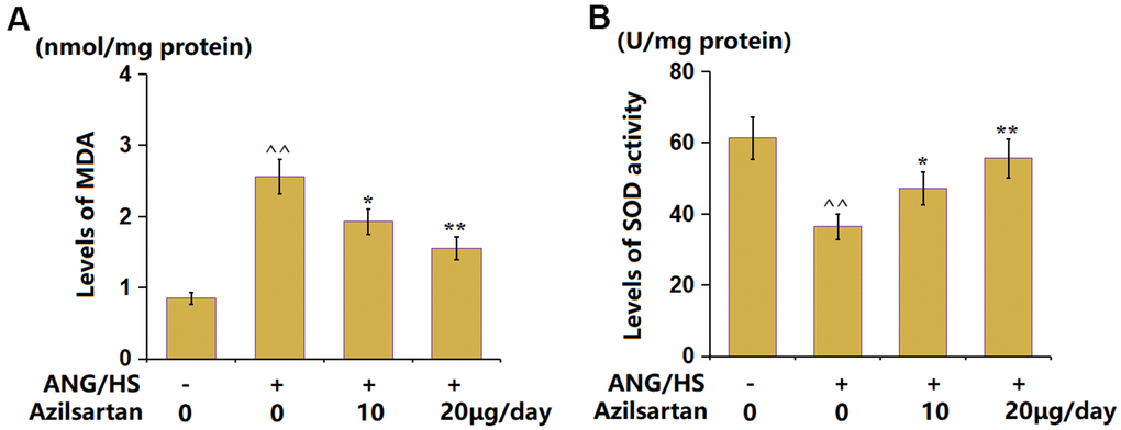 The MDA content in ANG/HS- challenged mice was enhanced from 0.85 to 2.56 nmol/mg protein, which was reduced to 1.93 and 1.55 nmol/mg protein by 10 and 20 μg/day Azilsartan, respectively (Figure 3A). In addition, the SOD activity levels (Figure 3B) in the control, ANG/HS, ANG/HS+ Azilsartan (10 μg/day), and ANG/HS+Azilsartan (20 μg/day) groups were 61.3, 36.5, 47.2, and 55.6 U/mg protein, respectively. Azilsartan exerted a suppressive function on OS in ANG/HS-challenged mice.