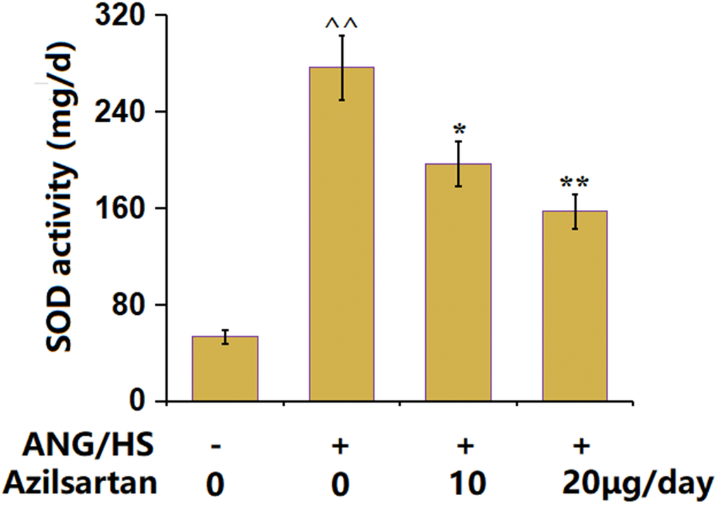The UAE in ANG/HS-challenged mice was found to be markedly increased from 53.5 mg/d to 276.3 mg/d, which signally declined to 196.5 mg/d and 157.2 mg/d by 10 μg/day and 20 μg/day Azilsartan (Figure 4), implying a repairment by Azilsartan on UAE in ANG/HS-challenged mice.