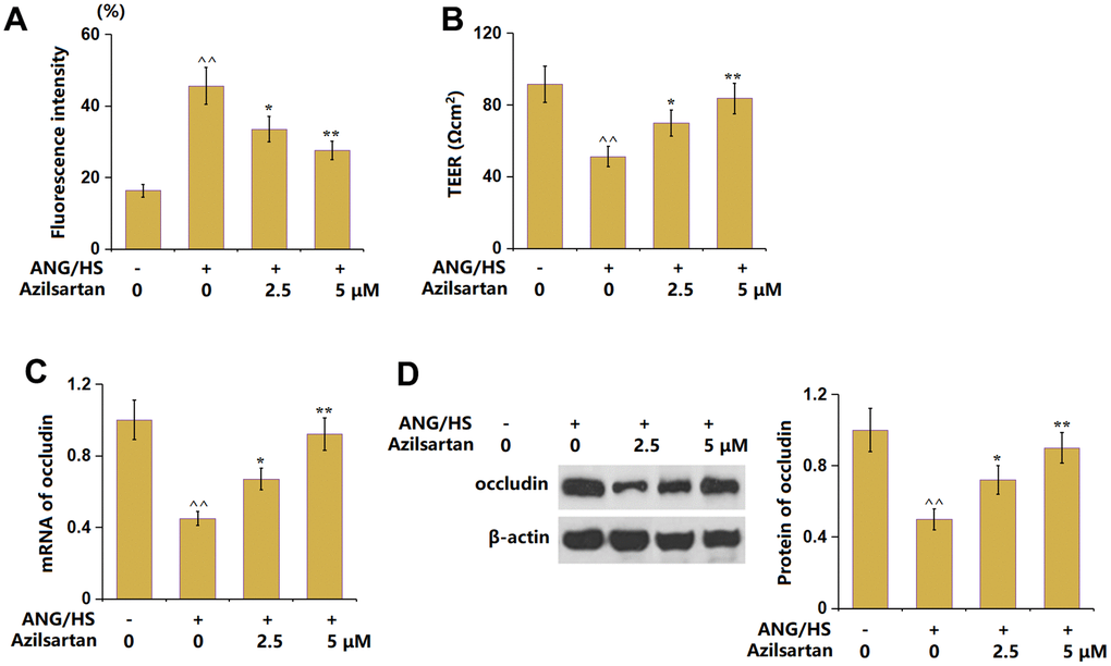 To probe the functional mechanism, an HrGECs monolayer was constructed and treated with ANG/HS with or without Azilsartan (2.5, 5 μM) for 24 hours. The fluorescence intensity of FITC-dextran in the ANG/HS-challenged HrGECs monolayer (Figure 6A) was increased from 16.3% to 45.6%, which was signally decreased to 33.5% and 27.6% by 2.5 and 5 μM Azilsartan, respectively. Furthermore, the TEER values (Figure 6B) in the control, ANG/HS, 2.5 μM Azilsartan, and 5 μM Azilsartan groups were 91.5, 51.2, 69.8, and 83.5 Ωcm2, respectively. Moreover, the occludin level (Figure 6C, 6D) in ANG/HS- challenged HrGECs was markedly repressed, but observably rescued by 2.5 and 5 μM Azilsartan. The increased endothelial monolayer permeability in HrGECs was ameliorated by Azilsartan.