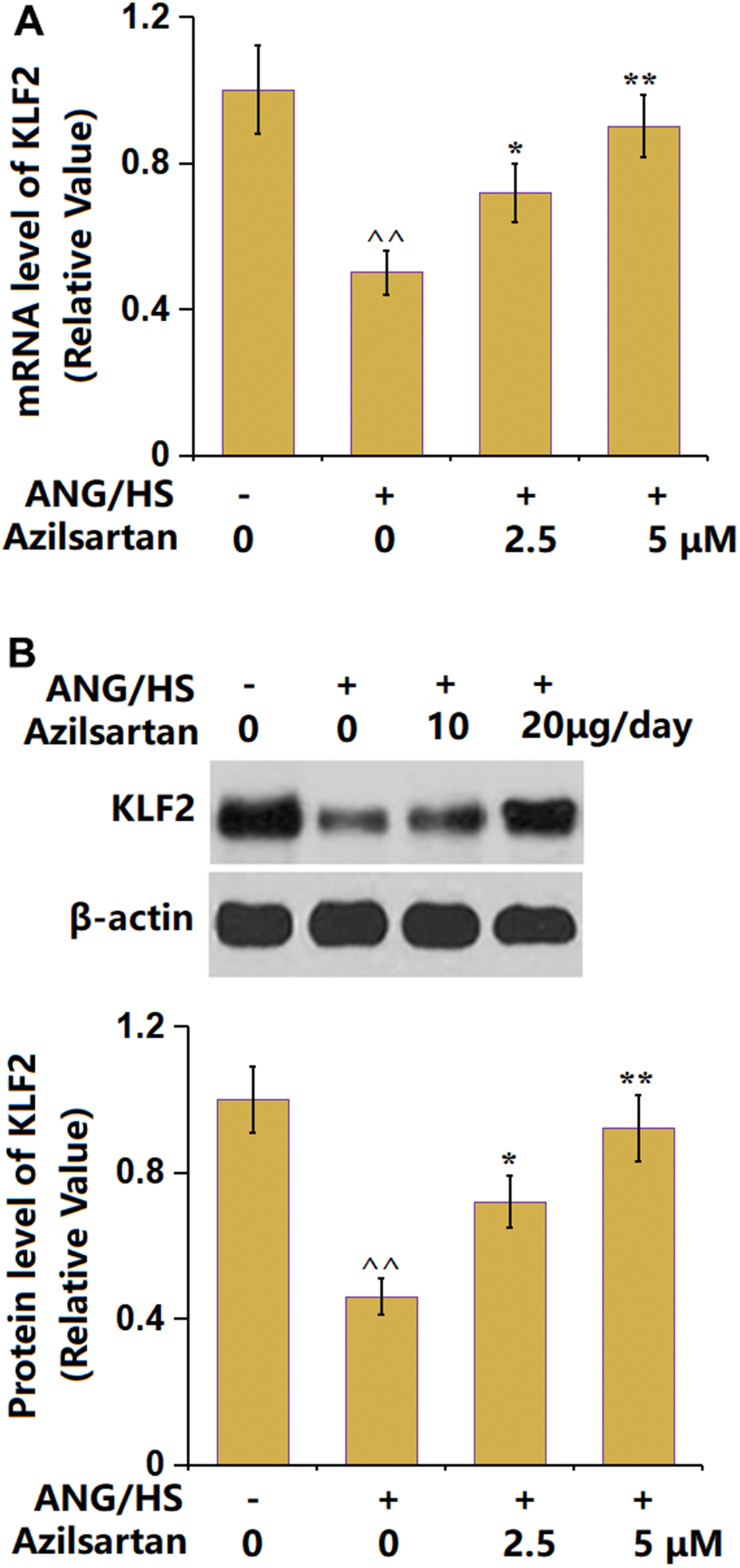 KLF2 is a regulatory transcriptional factor mediating TJ protein levels [25]. KLF2 (Figure 7) was found memorably downregulated in the ANG/HS-challenged HrGECs monolayer but signally upregulated by 2.5 and 5 μM Azilsartan, implying an involvement of KLF2 in the function of Azilsartan.