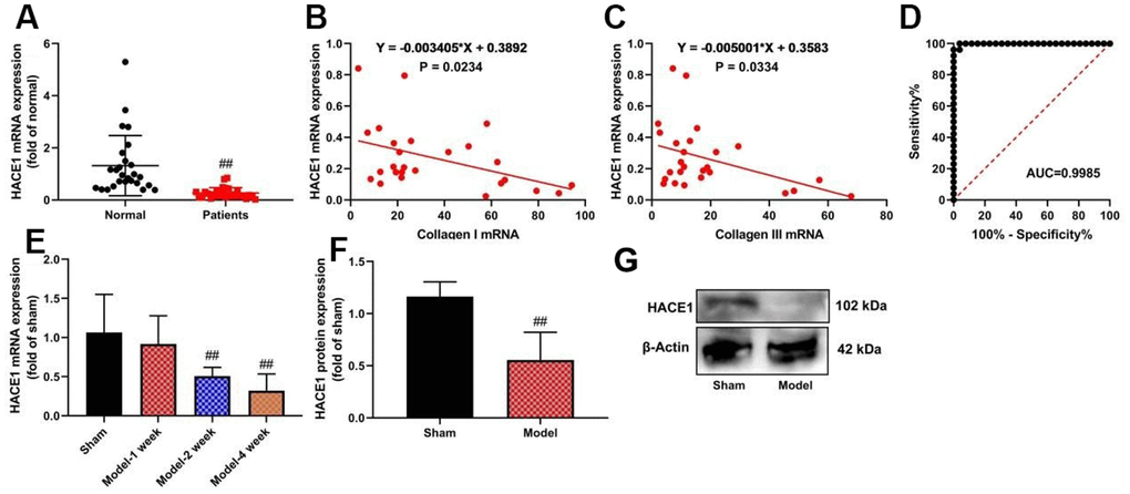 HACE1 mRNA expression was significantly inhibited in heart failure patients (p < 0.05) (Figure 1A). A negative correlation was observed between HACE1 serum expression levels and collagen I (p < 0.05) and collagen III (p < 0.05) in heart failure patients (Figure 1B, 1C). Receiver Operating Characteristic (ROC) curve analysis showed the diagnostic potential of HACE1 level (Figure 1D). HACE1 mRNA was up-regulated in mice with heart failure after 2-4 weeks of induction (p < 0.05) (Figure 1E). Expression of the HACE1 protein was detected in heart tissue samples from the heart failure mice model (Figure 1F).