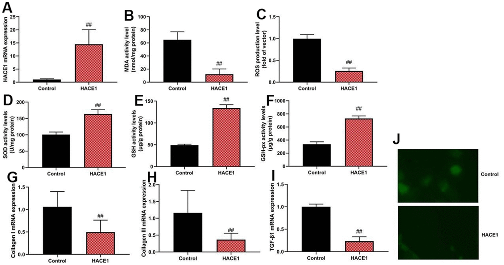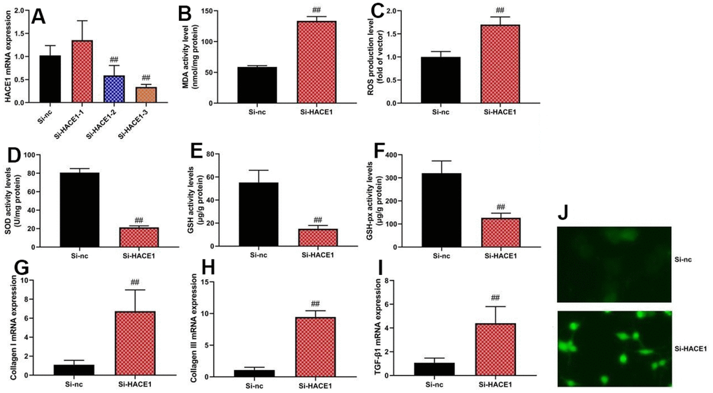 Knockdown of HACE1 via si-HACE1 decreased ROS and MDA levels (Figure 3A) (p < 0.05) but increased SOD, GSH, and GSH-PX levels (p < 0.05) in the in vitro heart failure model (Figure 3B–3F). HACE1 knockdown resulted in increased collagen I, collagen III, and TGF-β mRNA expression (p < 0.05) (Figure 3G–3I).