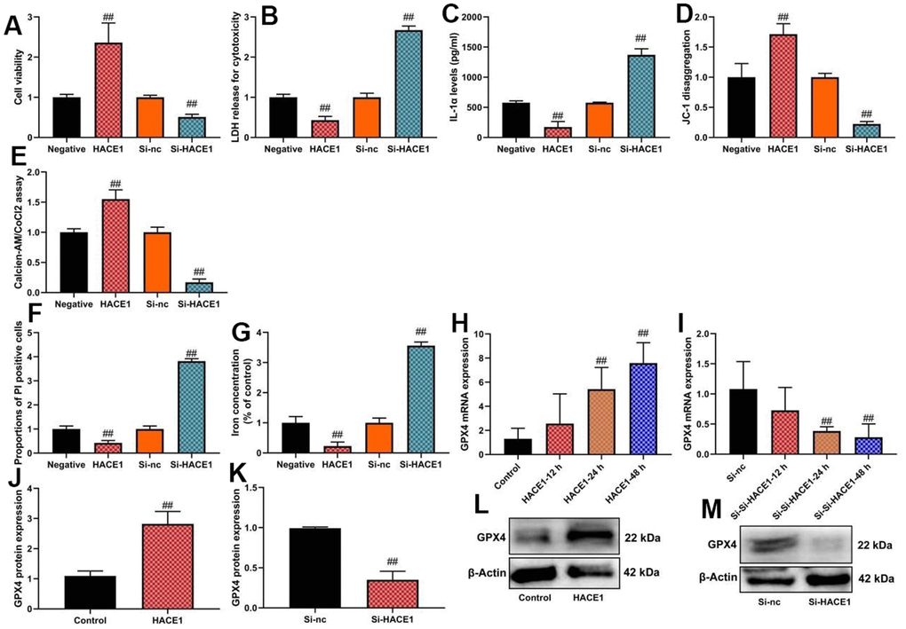 Up-regulation of HACE1 enhanced cell viability and promoted calcien-AM/CoCl2 levels (p < 0.05), reduced LDH activity and IL-1α levels (p < 0.05), and decreased PI-positive cells and iron concentration (p < 0.05) in the in vitro heart failure model (Figure 4A–4G). HACE1 overexpression increased GPX4 mRNA and protein expression (p < 0.05) (Figure 4H, 4J). HACE1 knockdown led to decreased cell viability, increased PI-positive cells and iron concentration (p < 0.05), and reduced GPX4 expression (p < 0.05) in the in vitro heart failure model (Figure 4A–4G, 4I, 4K).