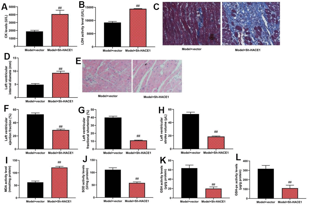 Sh-HACE1 aggravated CK and LDH activity (p < 0.05), increased left ventricular internal diameter, and caused heart tissue injury (p < 0.05). It also reduced ejection fraction, fractional shortening in left ventricles, and stroke volume of left ventricles in the heart failure mice model (p < 0.05). SOD, GSH, and GSH-PX levels were reduced by Sh-HACE1, while MDA levels were increased in heart tissue (p < 0.05) (Figure 5A–5L).