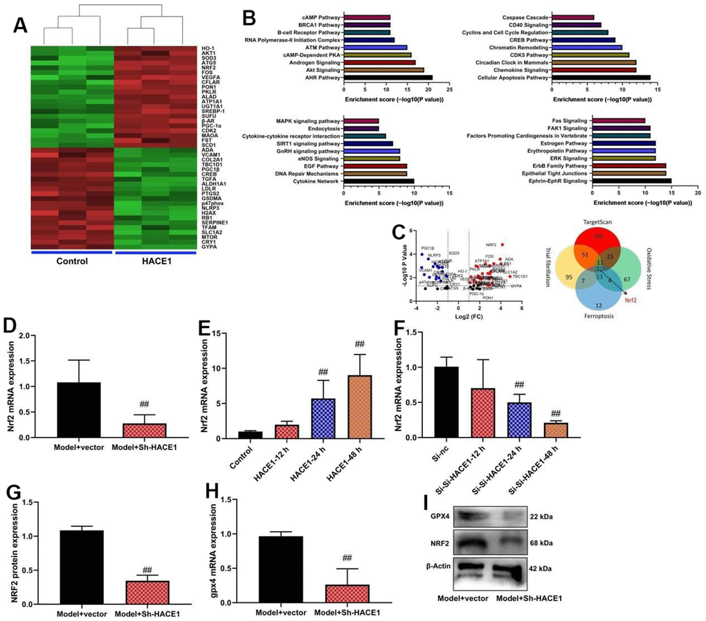 Sh-HACE1 reduced NRF2 mRNA expression in heart tissue (p < 0.05) (Figure 6D). HACE1 overexpression increased NRF2 mRNA expression (p < 0.05) (Figure 6E). HACE1 knockdown decreased NRF2 mRNA expression (p < 0.05) (Figure 6F). Sh-HACE1 reduced NRF2 and GPX4 protein expression in heart tissue (p < 0.05) (Figure 6H).