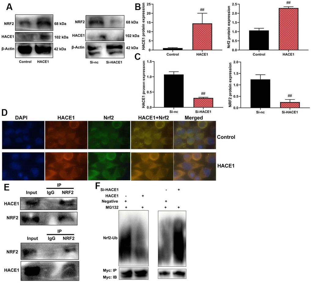 HACE1 up-regulation led to increased expression of both HACE1 and NRF2 proteins in the in vitro model (p < 0.05) (Figure 7A–7C). Microscopic examination confirmed increased expression of HACE1 and NRF2 when HACE1 was up-regulated (p < 0.05) (Figure 7D). Immunoprecipitation (IP) showed a relationship between HACE1 and NRF2 proteins (Figure 7E). Up-regulation of HACE1 reduced the Ubiquitination of NRF2, while si-HACE1 promoted NRF2 Ubiquitination (p < 0.05) (Figure 7F).