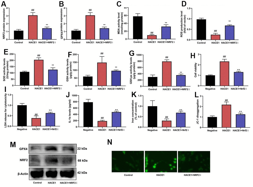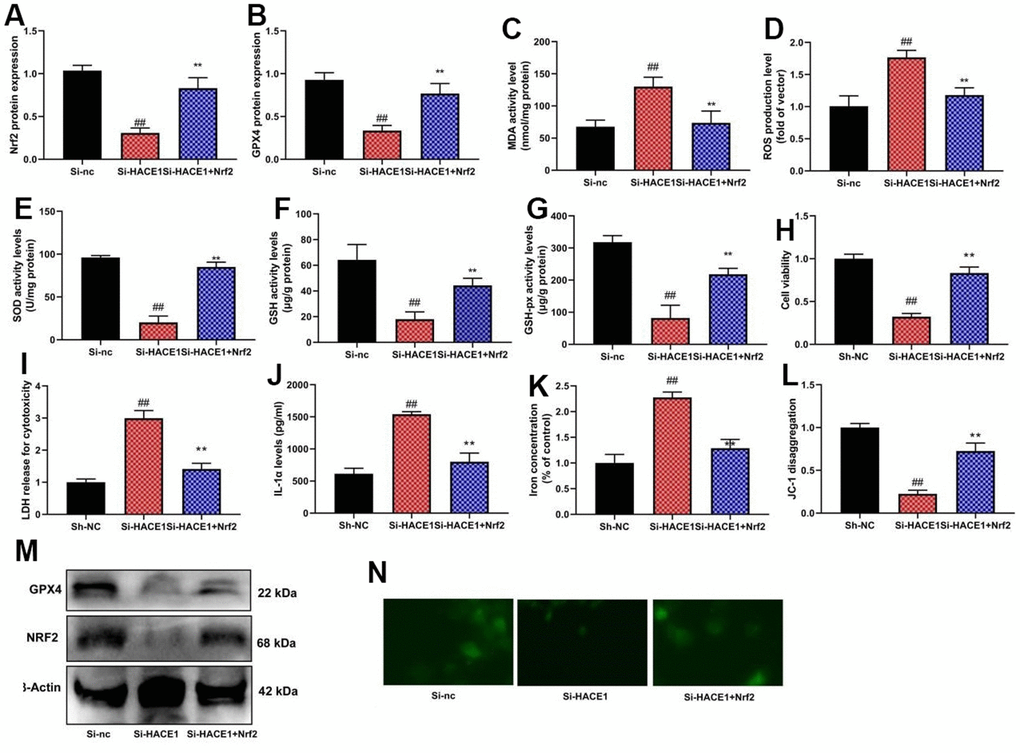 NRF2 inhibitor mitigated the impact of HACE1 on Nrf2 and GPX4 expression, oxidative stress, and ferroptosis in vitro (p < 0.05) (Figure 8). NRF2 agonist countered the impact of si-HACE1 on Nrf2 and GPX4 expression, oxidative stress, and ferroptosis in vitro (p < 0.05) (Figure 9).